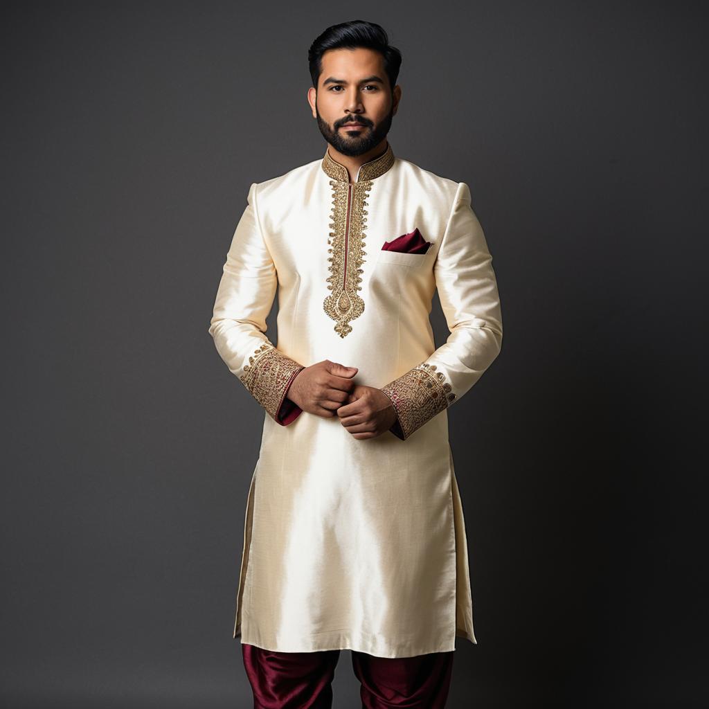 Man Wearing Traditional Cream Satin Kurta with Gold Embroidery