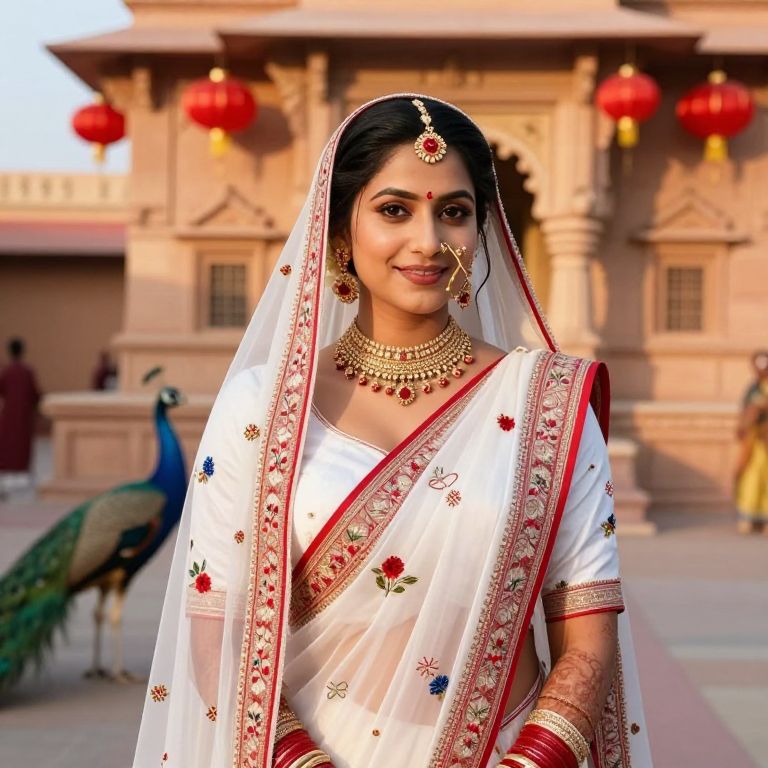 A regal Indian bride dressed in a classic white sari with red borders and a delicate floral pattern, wearing a choli and a traditional veil. Her face is radiant with natural makeup, with a full curved smile and a gentle nose. She poses in front of a beautifully decorated temple in Rajasthan, with peacocks and red lanterns in the background, the setting sun reflecting off the sandstone walls.
