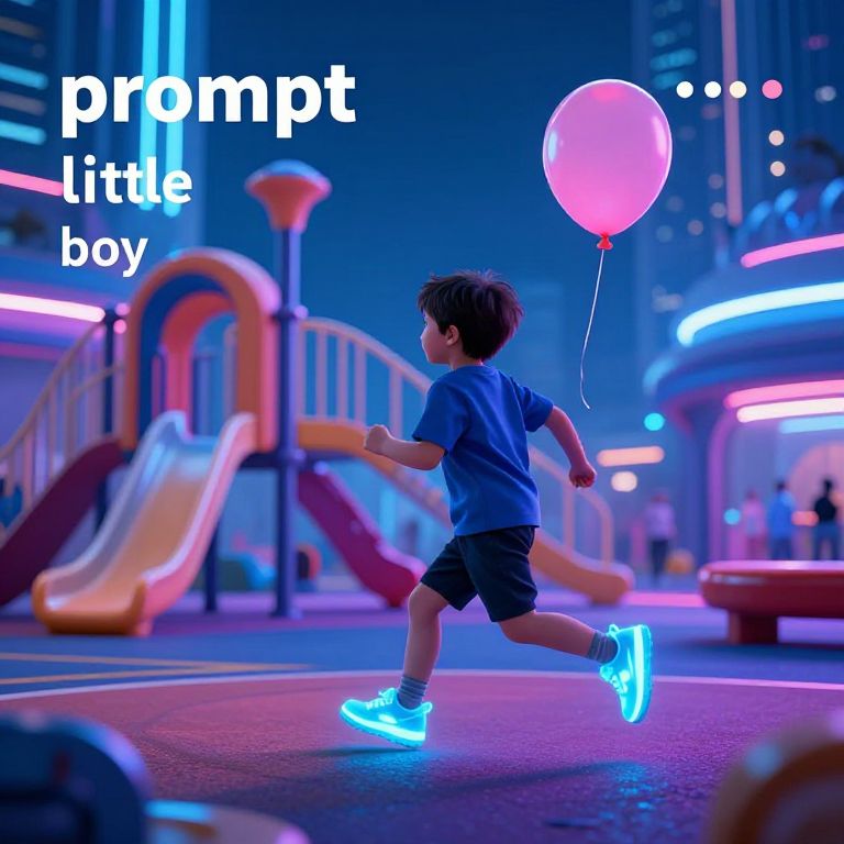 A futuristic playground in a neon-lit city, where a little boy runs with glowing sneakers and a floating balloon; the keyword 'prompt little boy' brings together imagination and technology in a sleek, modern, sci-fi aesthetic.