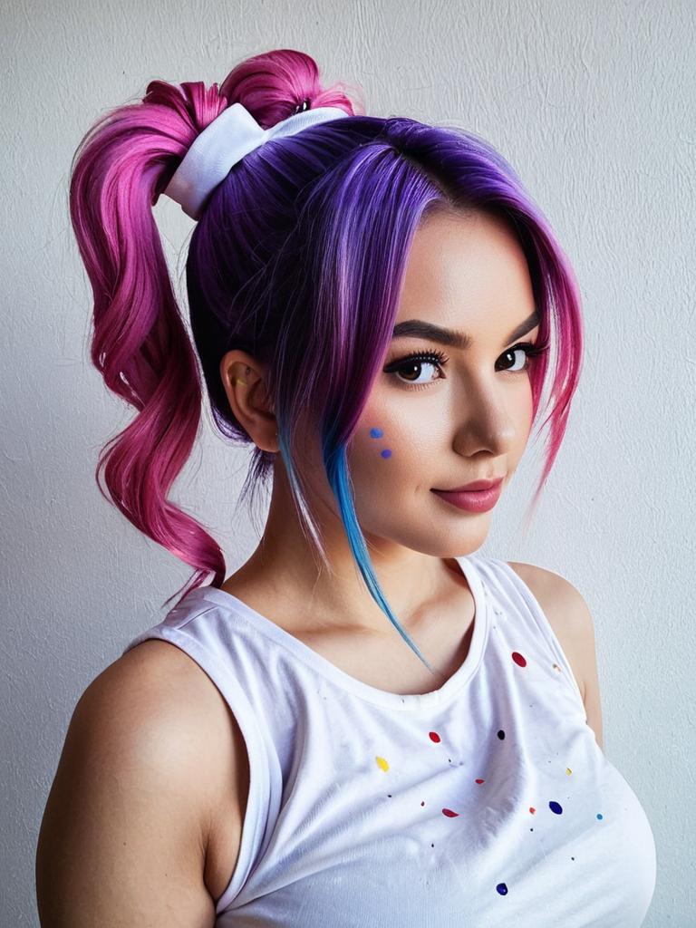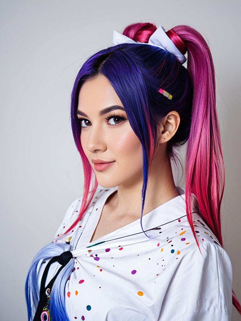 Photo-realistic cosplay photo of person in airani iofifteen costume. 1girl, purple eyes, pink hair, long hair, gradient hair, blue hair, single hair bun, side ponytail, single side bun, hair ornament, hairband, medium breasts, collarbone, white shirt, virtual youtuber, virtual youtuber, paint splatter on face. full body shot
