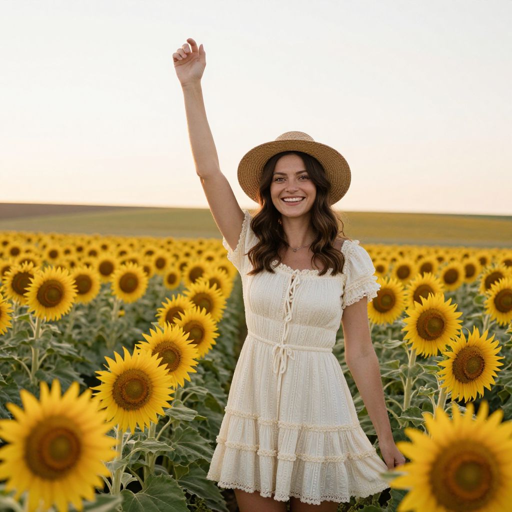 Smiling woman in white dress and straw hat, raising arm in sunflower field at sunset; vibrant yellow sunflowers surround her.