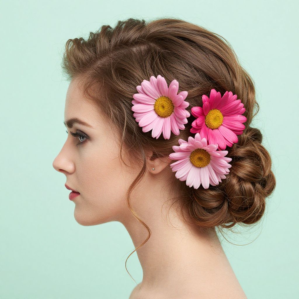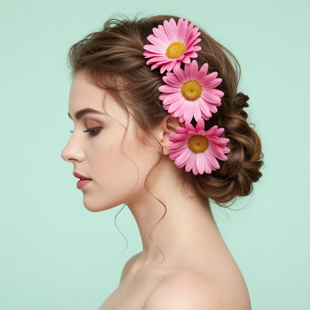 Spring portrait featuring a woman with a beautifully styled hairstyle adorned with three vibrant pink daisies, each with a golden center, set against a soft mint-green background.