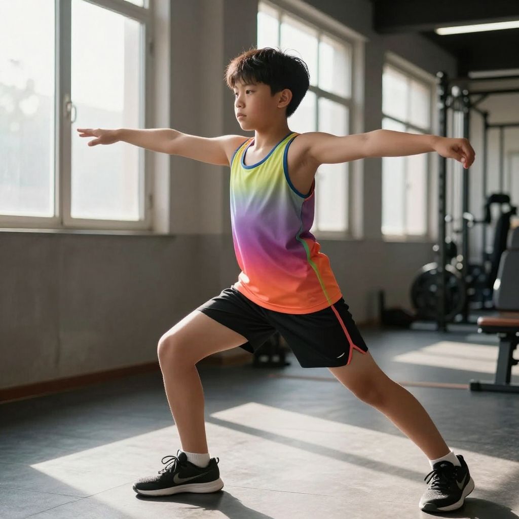 Photograph of an Asian teenage boy in a colorful gradient tank top and black shorts, performing a dynamic stretching pose in a sunlit gym.