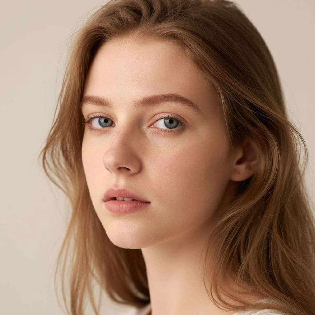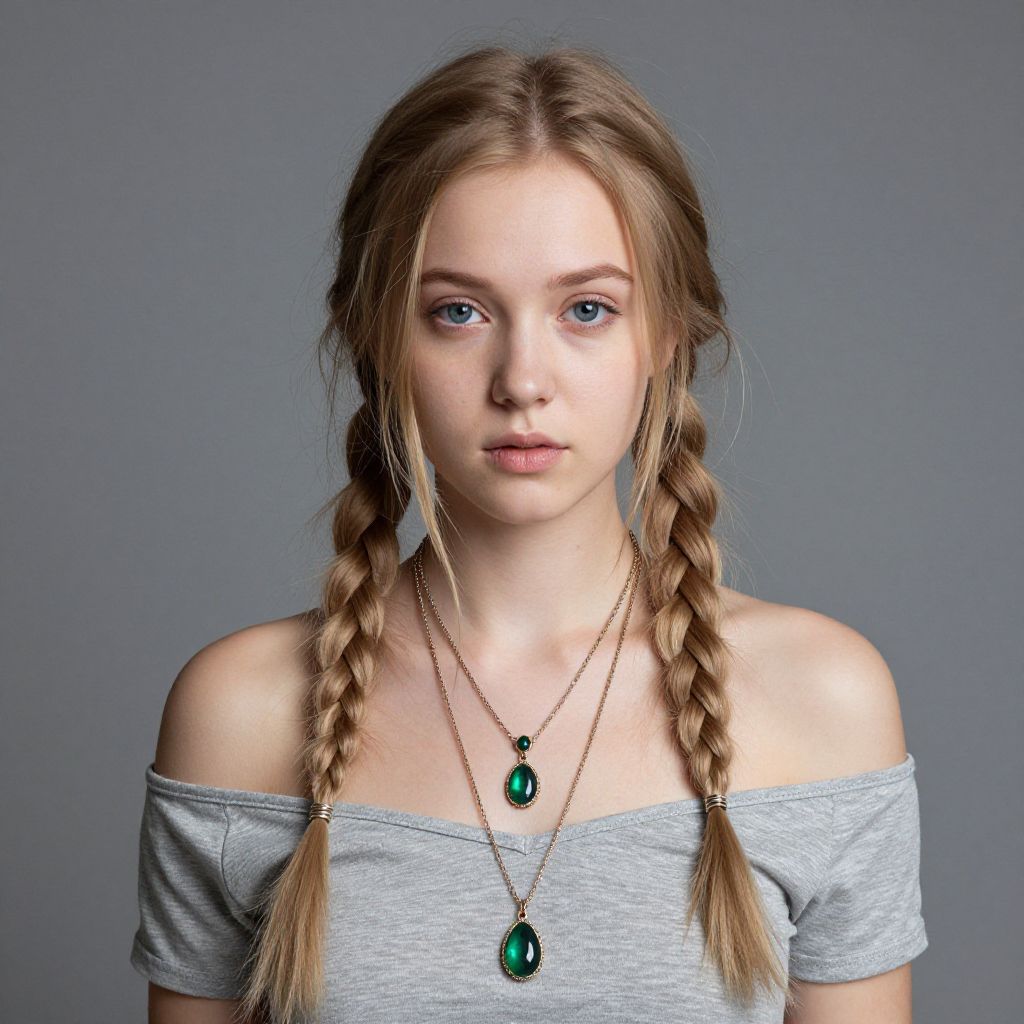 Photograph of a young woman with fair skin and blue eyes, set against a plain dark gray background. She has long, straight blonde hair with a small braid crown on the top. Her makeup is subtle, with light pink lipstick and a hint of blush. She wears a silver necklace with a small pendant and silver hoop earrings. Her gray strapless top shows her bare shoulders. The lighting is soft, highlighting her face and hair.