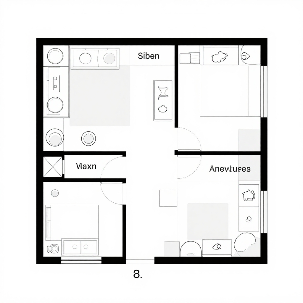 Black and white schematic floor plan of a minimalistic animal shelter featuring efficient use of space. The layout includes distinct areas labeled for staff, animal grooming, and cozy resting zones for animals. The design emphasizes simplicity and functionality in a compact layout.