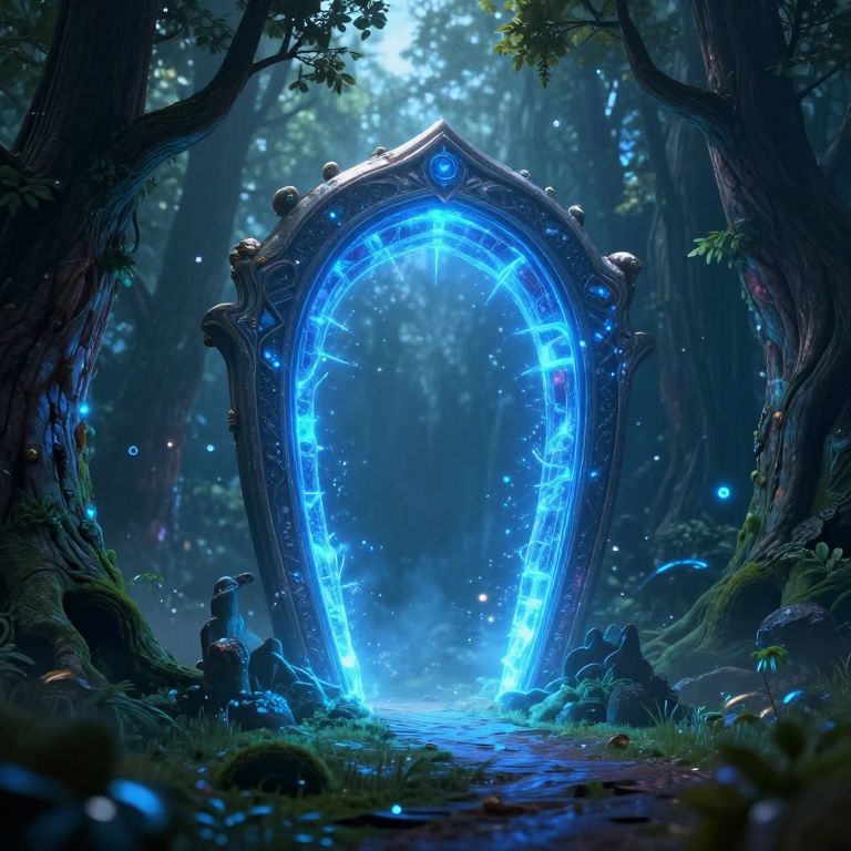 Mystical blue glowing archway in enchanted forest, surrounded by dark trees and luminescent particles, illuminated by ethereal light. Digital art.