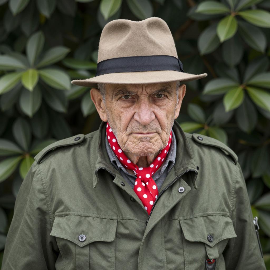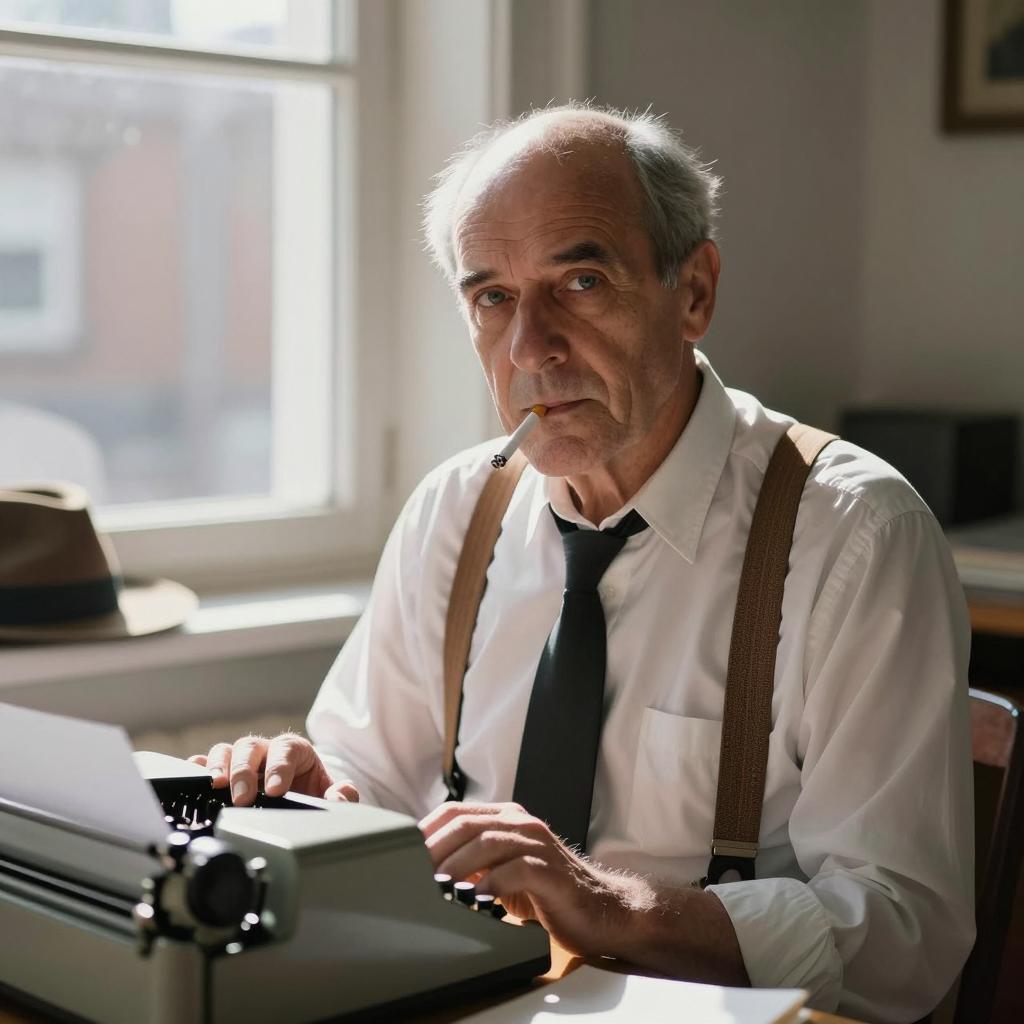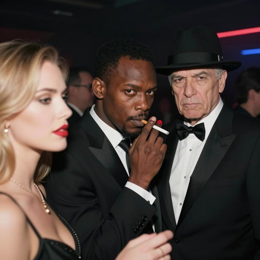 An elderly man wearing a black suit, white shirt, black tie, and black hat is smoking a wooden pipe. He has a serious and intense expression on his face. Behind him, another older man in a beige vest and white shirt stands in front of wooden shelves filled with various bottles, suggesting a bar or vintage setting.
