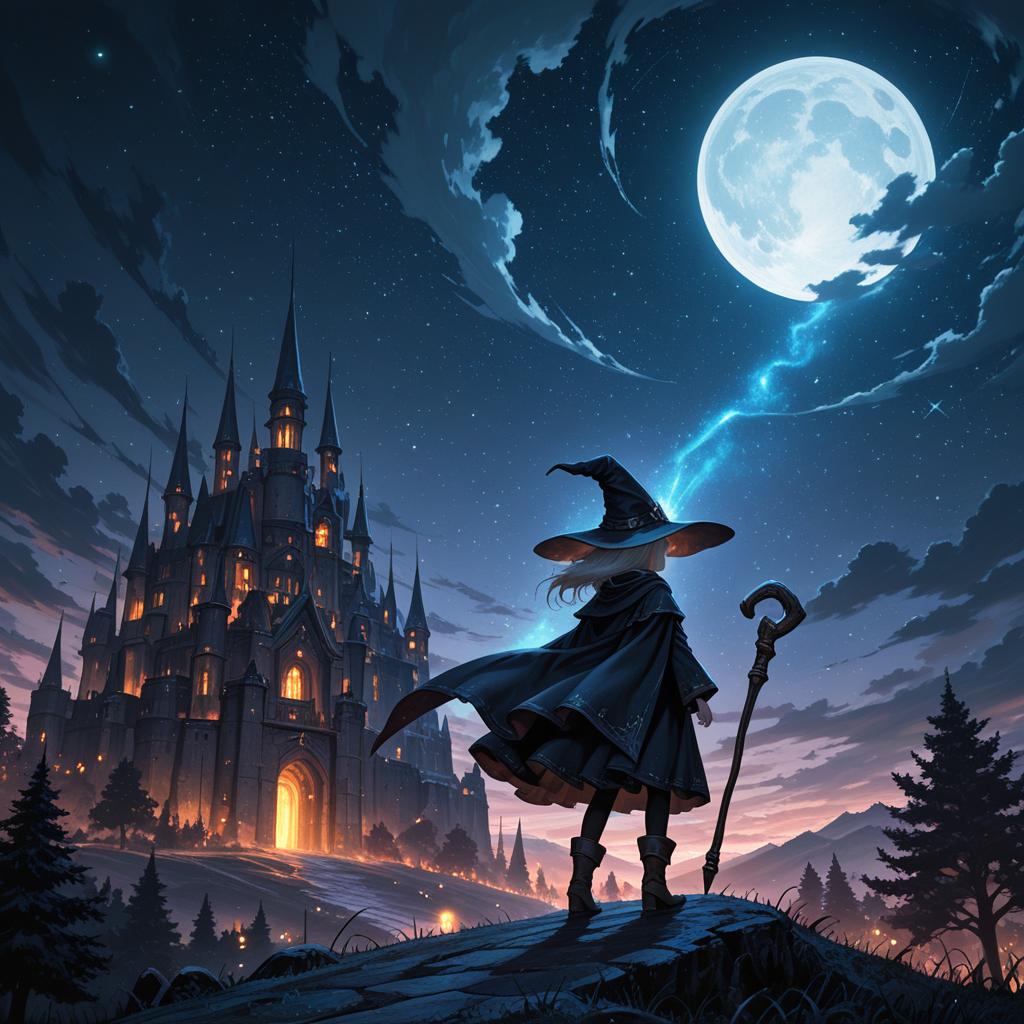 Detailed fantasy illustration of a solitary young witch standing outdoors at night, wearing a pointed hat, cape, and boots. She holds a staff and faces a glowing full moon surrounded by stars and swirling clouds. In the background, a large, illuminated castle towers over a forest landscape under a starry night sky.
