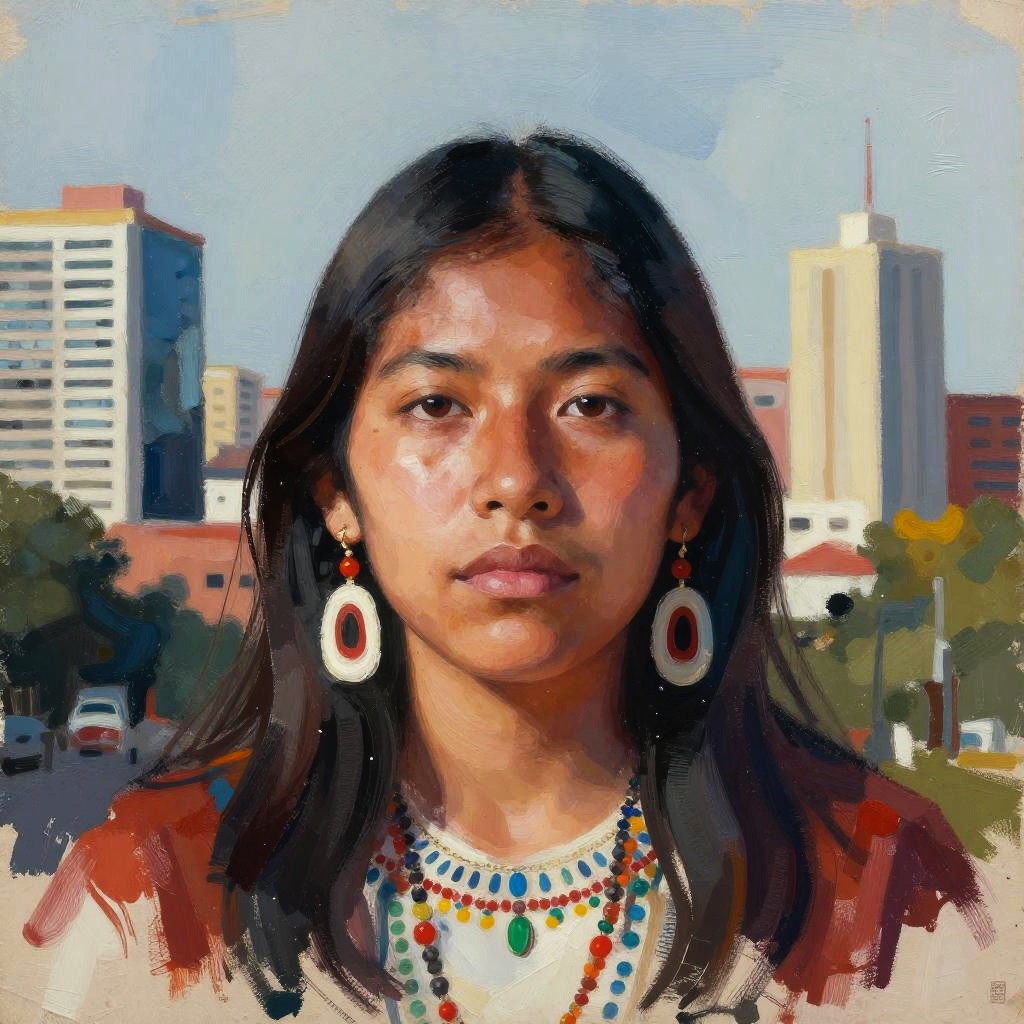 Persona mestiza depicted in a surreal style, merging symbols of indigenous heritage and modern urban life, expressive colors, fluid brushstrokes, emphasizing identity and cultural fusion