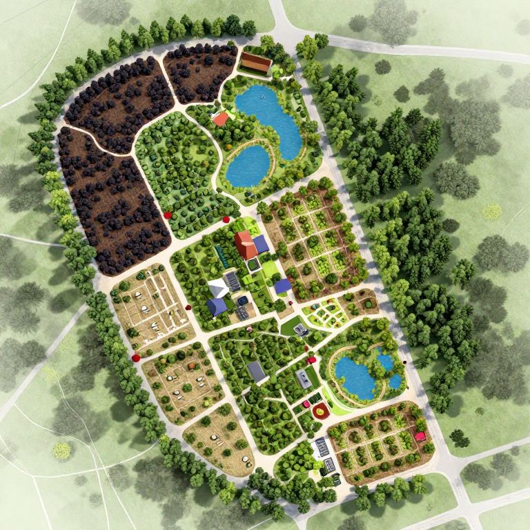 A detailed, hyperrealistic planning map for a permaculture farm and food forest, featuring colorful sections for dark color zones, trees, ponds, forests, houses, barns, walking paths, and other elements.