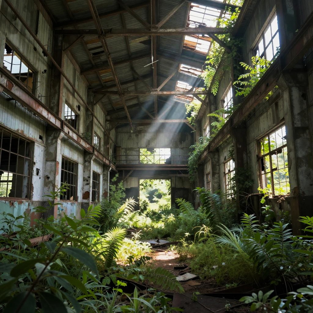 Photo AI generator rendering an abandoned industrial factory overtaken by wild greenery, rays of sunlight piercing through broken windows, detailed decay with contrasting bright foliage, cinematic composition