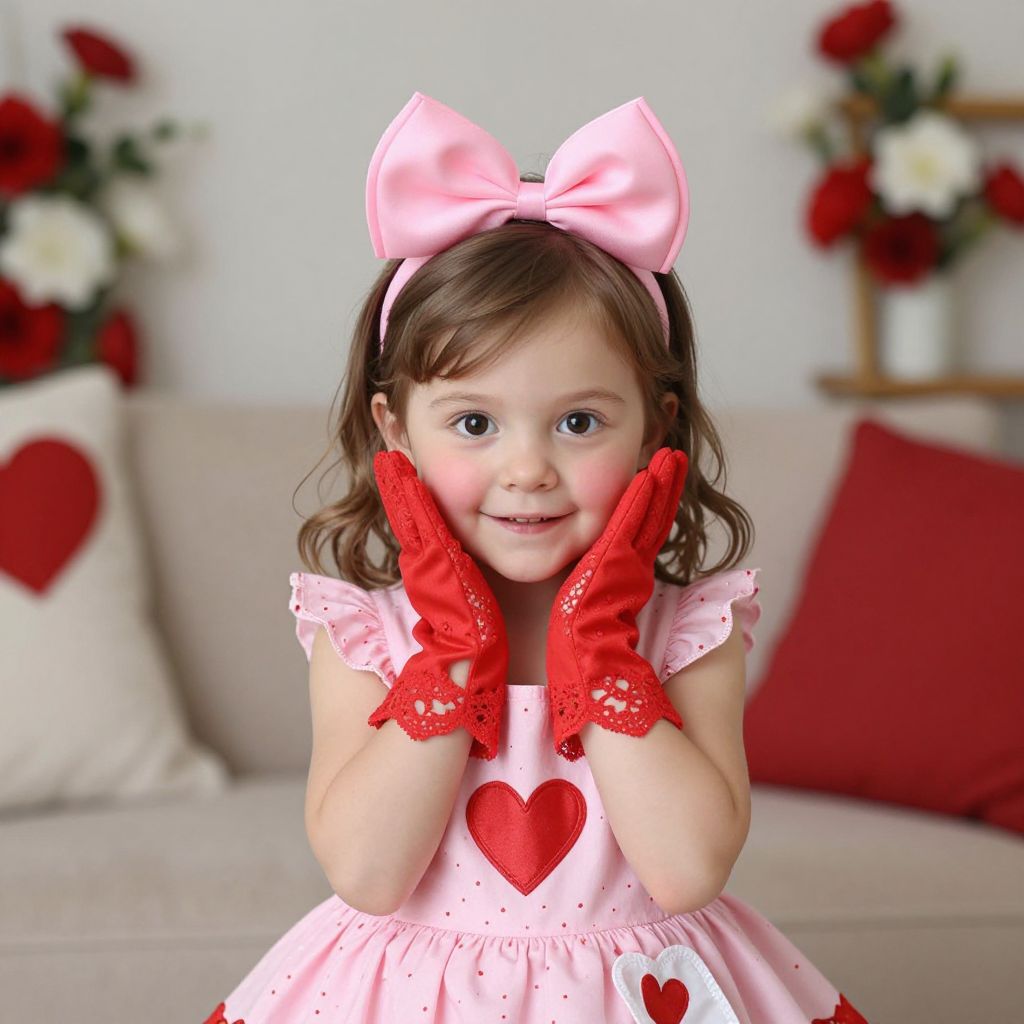 Photograph of a young Caucasian girl with light skin and brown hair, wearing a large pink bow on her head, a pink dress with red hearts, and red lace gloves. She smiles with her hands raised to her cheeks. The background features a beige sofa with red and white heart-patterned pillows, and blurred floral arrangements in red and white. The lighting is bright, highlighting her cheerful expression and the vibrant colors of her outfit.