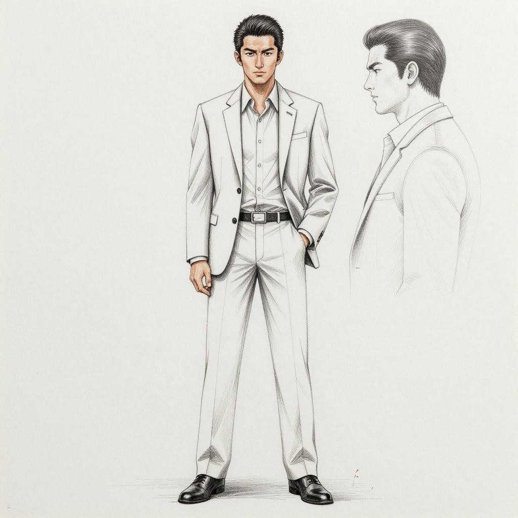 This digital drawing features a confident, dark-haired man in a white suit, white dress shirt, and black belt with black dress shoes. His right hand is in his pocket, and he stands with a relaxed, yet assertive posture. The suit is detailed with clean lines and subtle shading, emphasizing its crisp, formal appearance. To the right, there is a larger, grayscale sketch of the same man in profile, adding depth and perspective. The background is plain white, making the subject stand out. The overall style is modern and semi-realistic, with a focus on sharp contrasts and clean aesthetics.