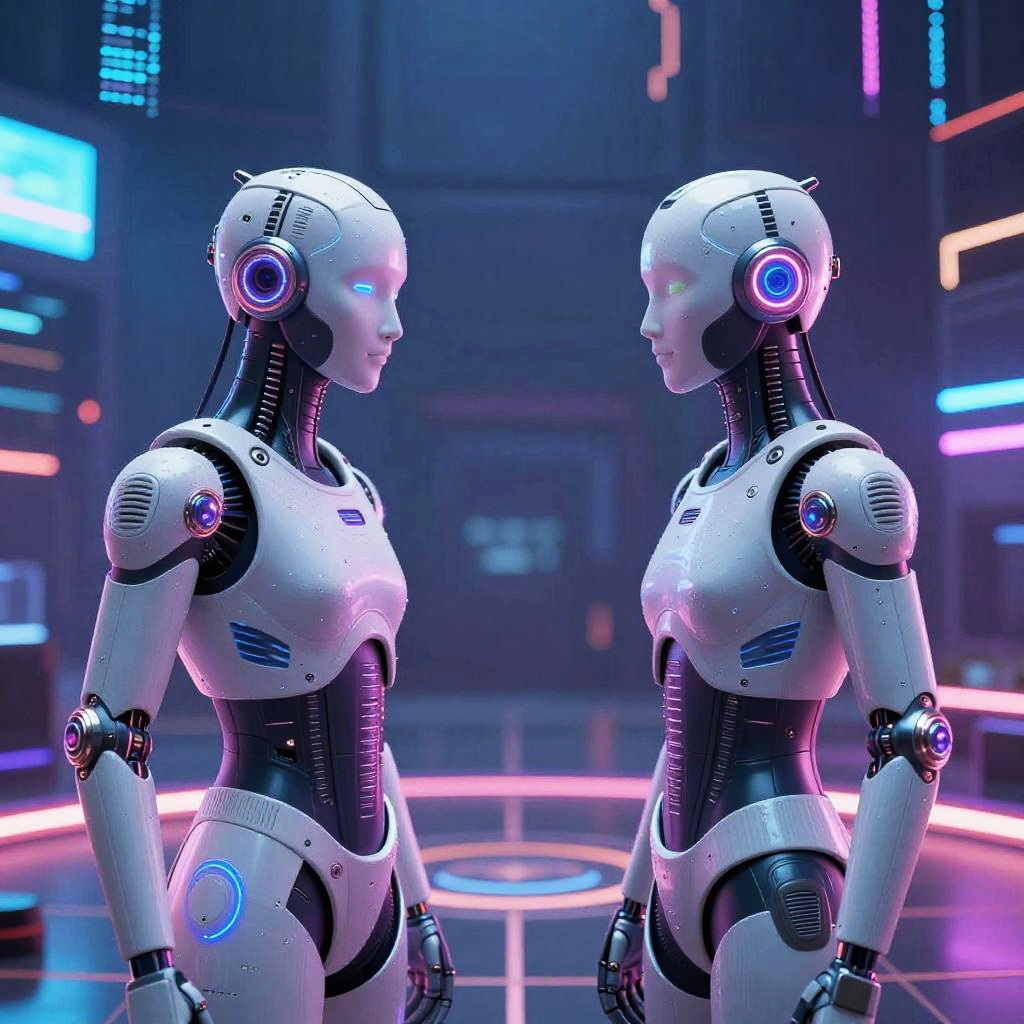 Photorealistic CGI of two sleek, white and black humanoid robots with glowing blue and pink accents, standing face-to-face in a futuristic, neon-l
