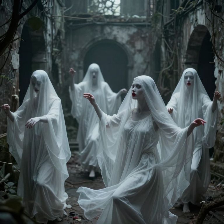 Amidst the echoes of decay and the whispers of forgotten souls, spectral figures draped in white veils navigate the labyrinth of memory, their crimson lips a haunting reminder of life's fragility and the eternal dance between presence and absence.