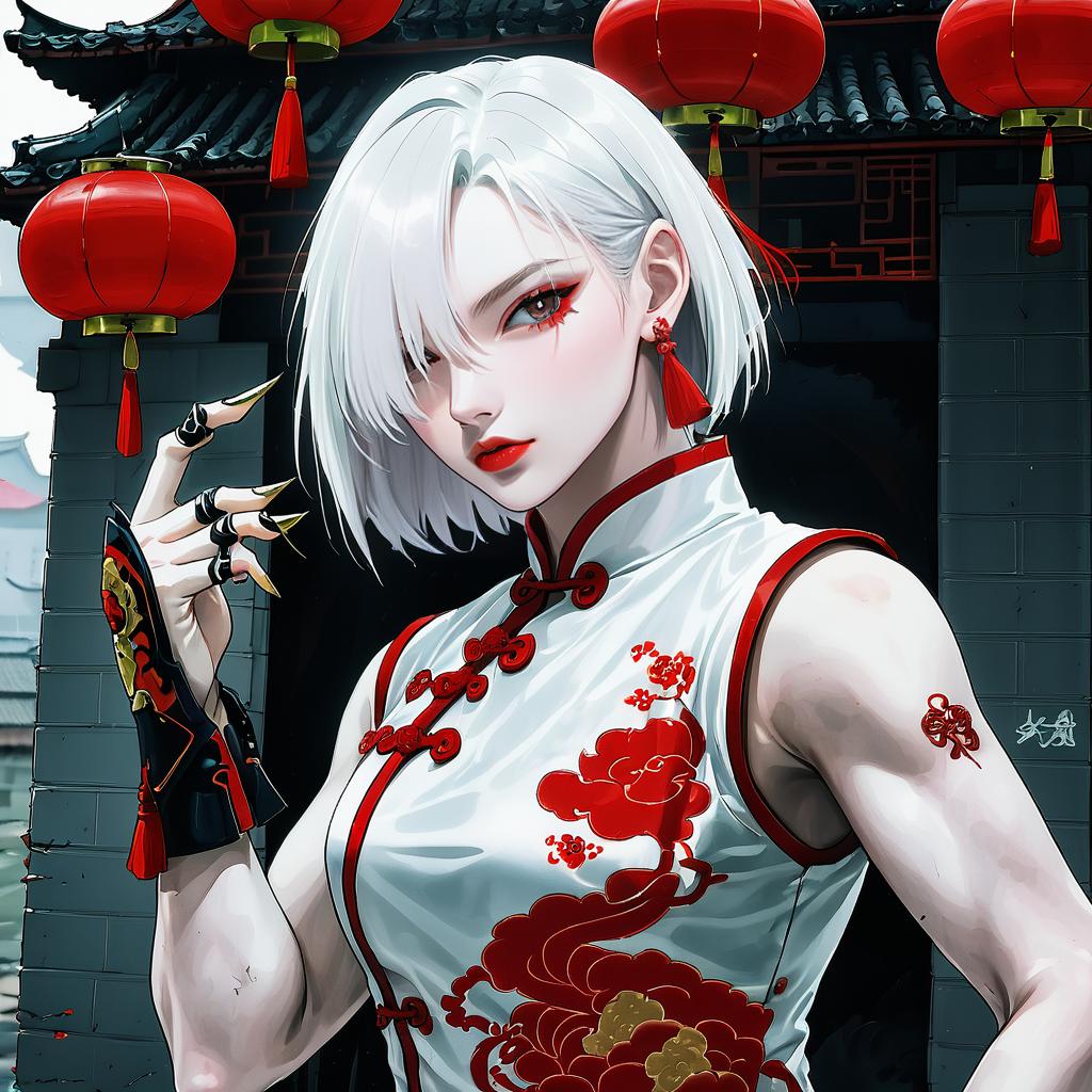 Digital anime-style illustration of a young woman with pale skin and short white hair partially covering one eye. She has striking red eyes and lips, wearing a traditional white Chinese dress with red floral patterns and red trim. She accessorizes with red tassel earrings and black claw gloves and rings. The background features traditional Chinese architecture and red paper lanterns.