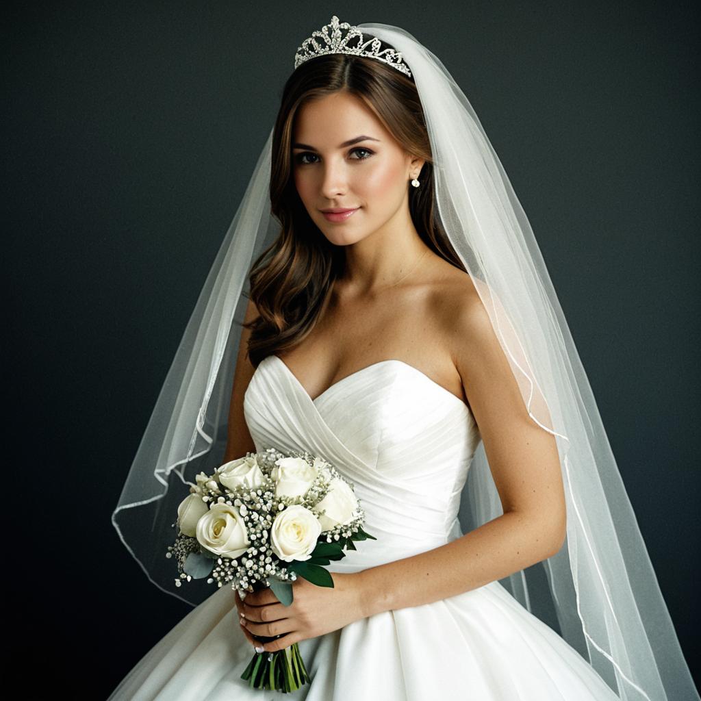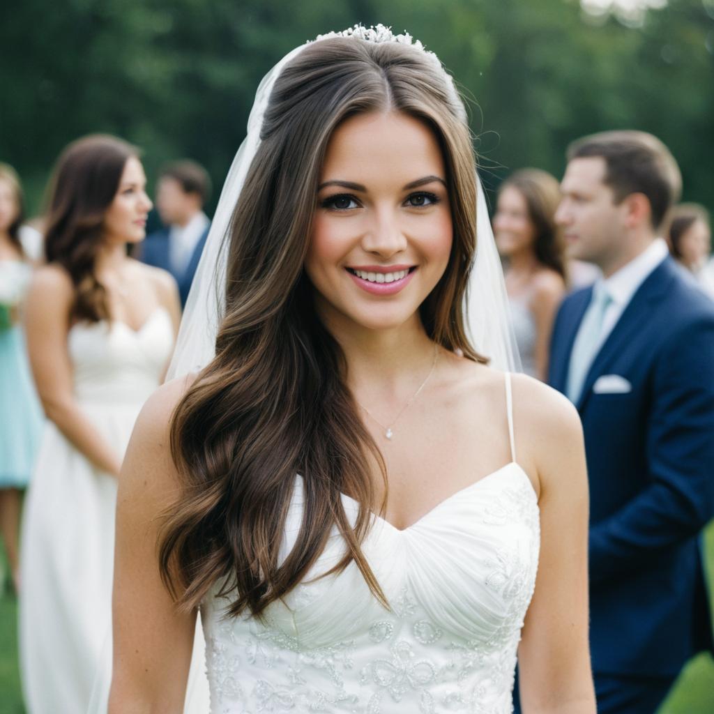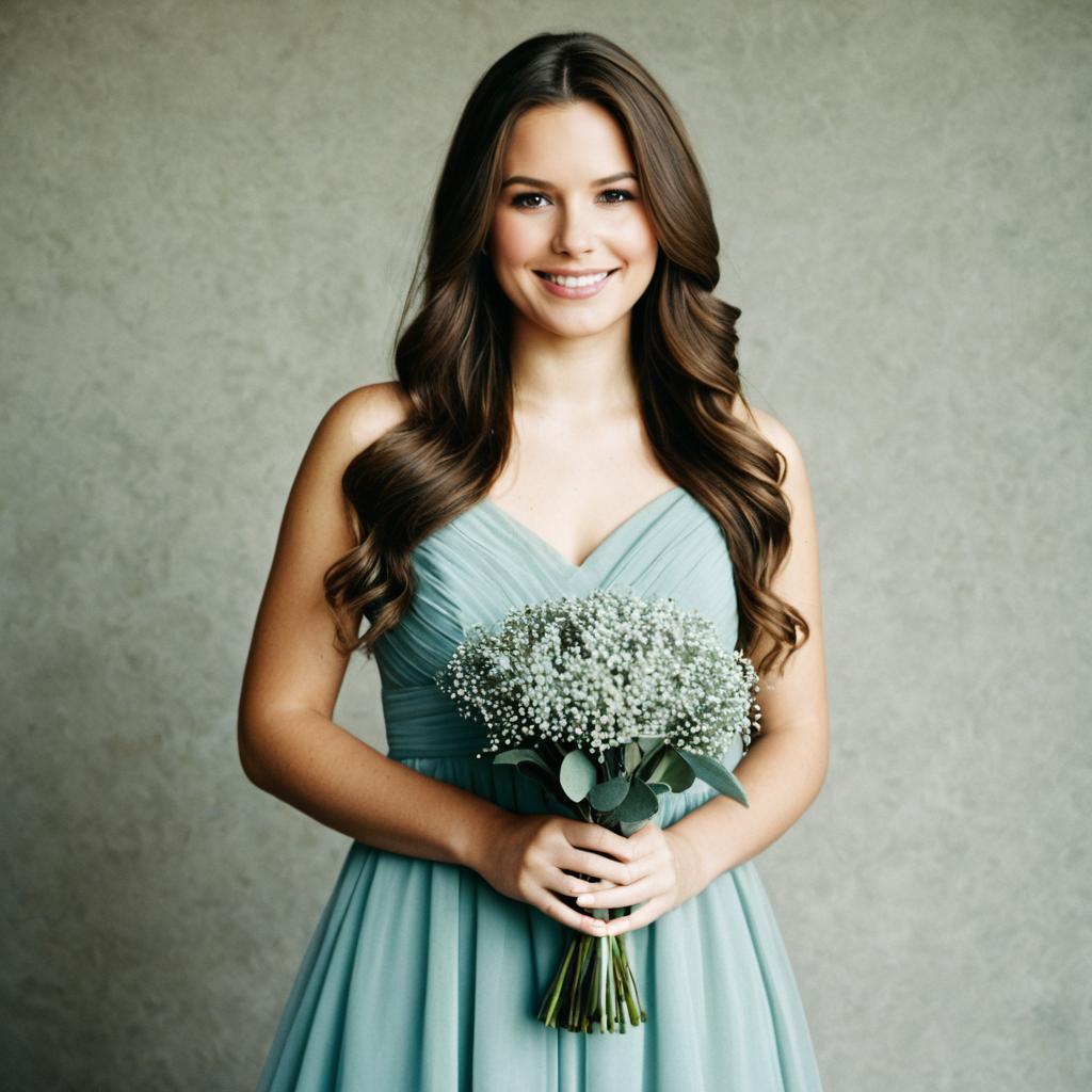 Sage bridesmaid dress,1girl, solo, dress, flower, brown hair, bouquet, holding, smile, blue dress, realistic, looking at viewer, lips, long hair