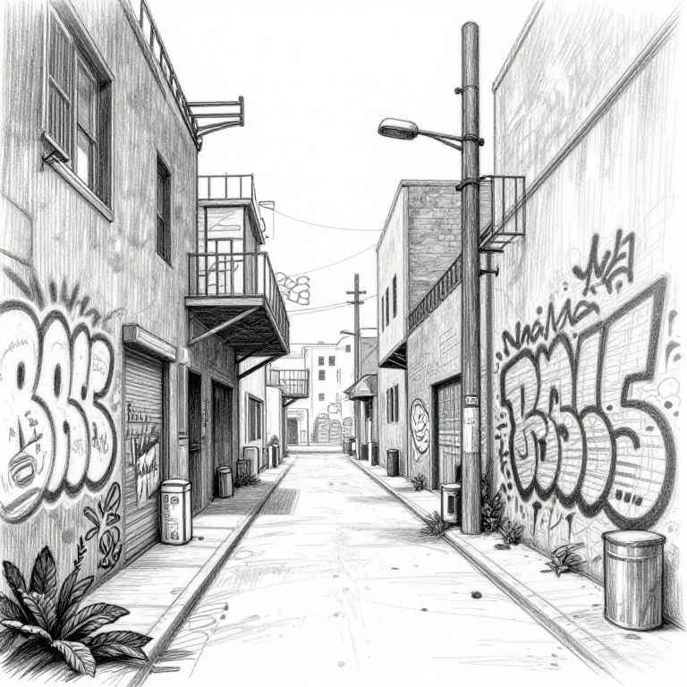 Peppermint a messy sketch of a downtown LA alley with graffiti walls, 8bit style, pencil sketch style,