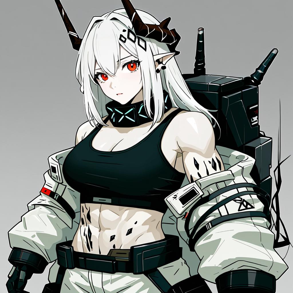 Mudrock (elite ii) (arknights), arknights, 1girl, pointy ears, horns, ear piercing, red eyes, hair between eyes, long hair, white hair, grey hair, hair ornament, large breasts, cleavage, navel, black sports bra, black gloves, bare shoulders, off shoulder, long sleeves, black choker, oripathy lesion (arknights), material growth, infection monitor (arknights), crop top, midriff, stomach, by artist biyon, anime