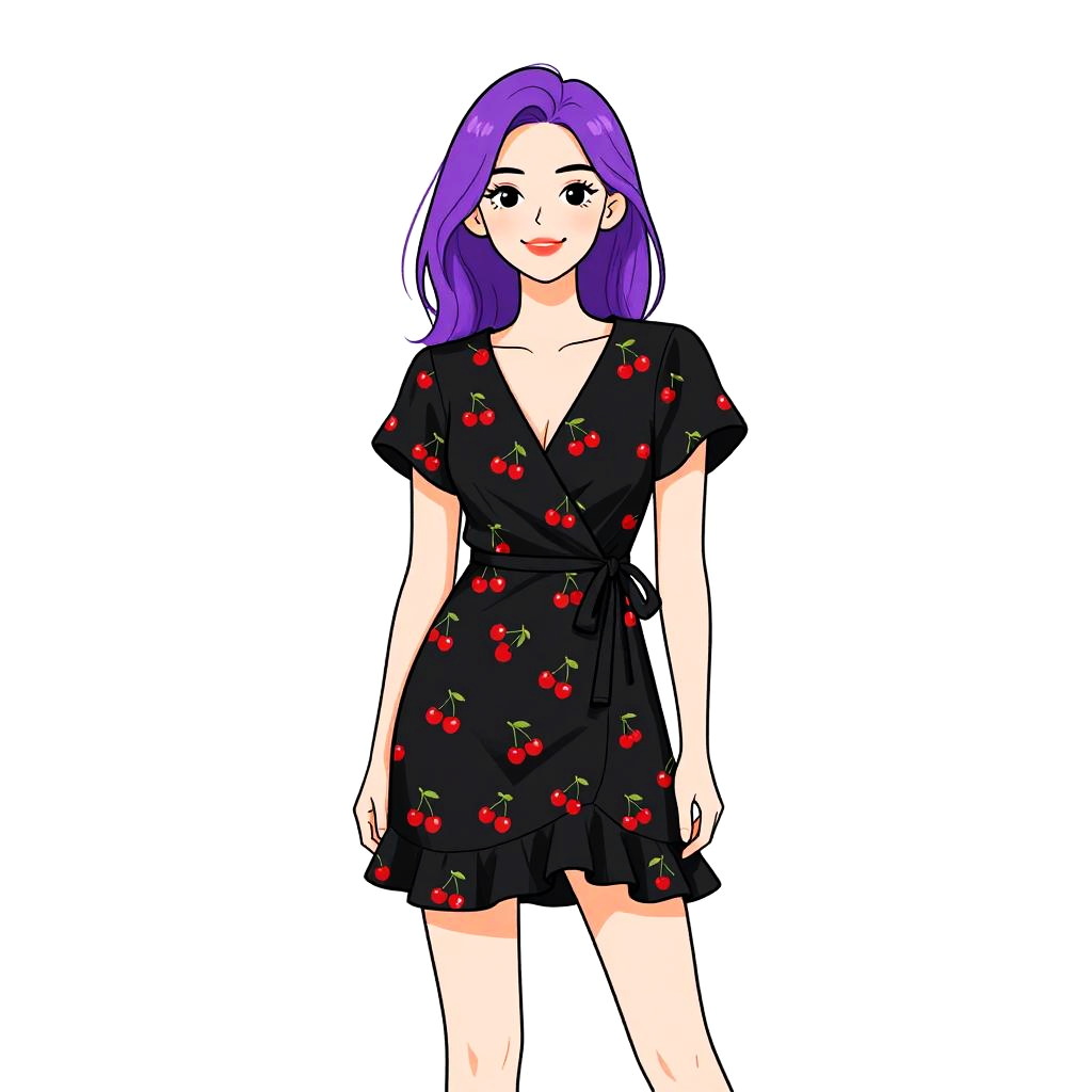 Woman with pretty face and pretty hair. smiling Woman, casual chic, black wrap mini dress with red cherry print, short flutter sleeves, V-neckline, side tie at waist, subtle ruffles along the hem, plain white background. --sref 1467