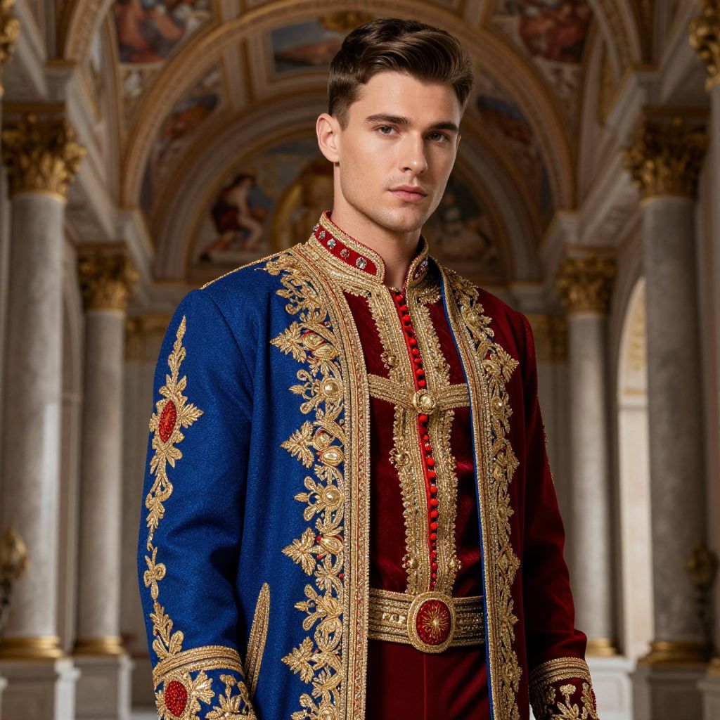A handsome man with a neatly trimmed, short brown hairstyle, wearing a magnificent, ornate outfit in royal blue and deep red, richly accented with gleaming gold embroidery and crimson details, exuding an undeniably regal and sophisticated vibe, standing confidently within a grand, historically inspired hall featuring towering columns and intricate frescoes.