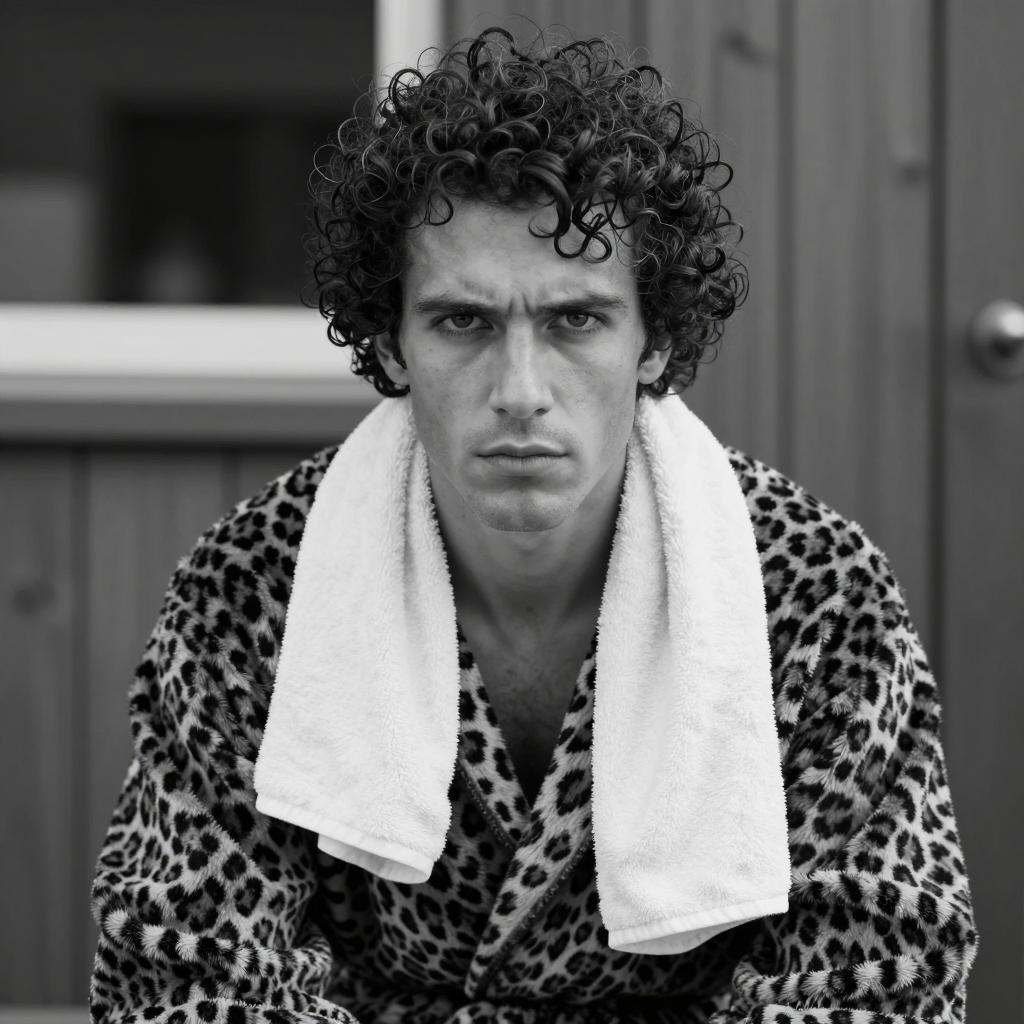 Black-and-white portrait of a young curly-haired man sitting against a wooden structure. He wears a leopard-print robe and has a white towel draped around his neck, with a stern and intense facial expression. The blurred background features wooden panels.