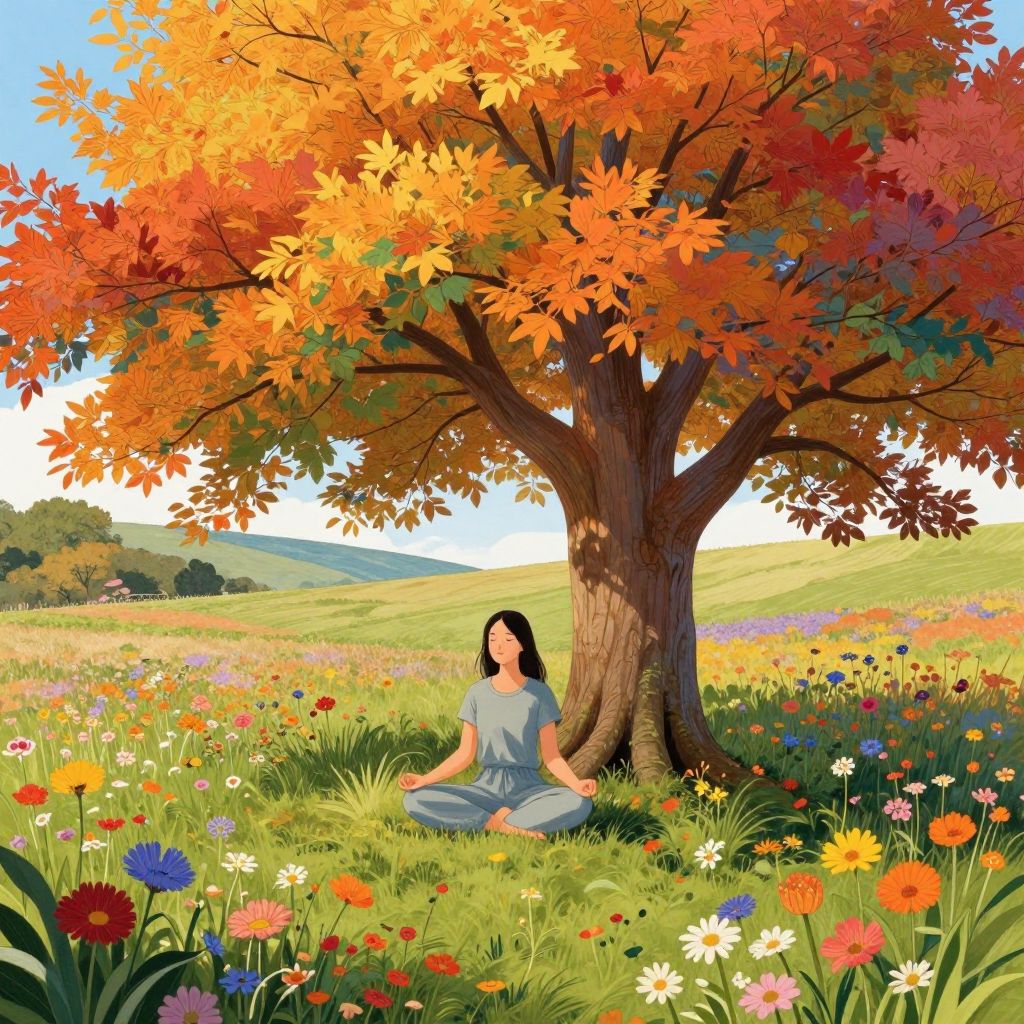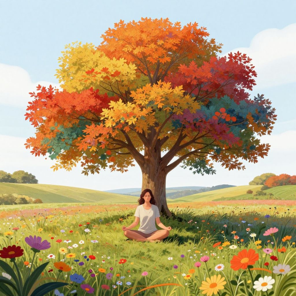 Woman meditating beneath a vibrant, multicolored tree with autumnal leaves, surrounded by a field of colorful wildflowers, as depicted by Design By Pie, an illustrator based in North Devon.