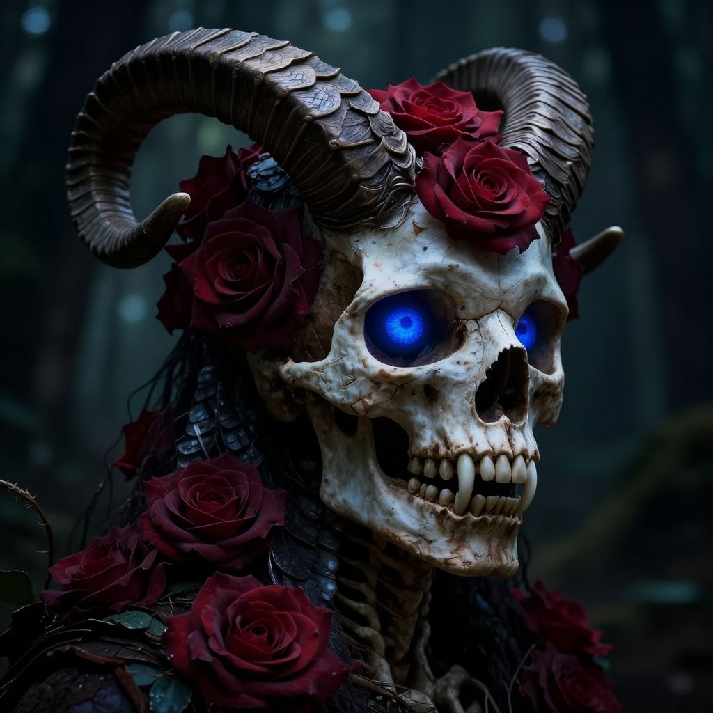 A dark, digital CGI image of a skeletal, demonic face with large, curved, textured horns adorned with deep red roses. The skull has glowing, bright blue eyes and a cracked texture on its surface. The background is a blurred, dark forest, adding to the eerie atmosphere. The roses and horns contrast sharply with the pale, weathered bones, creating a striking, gothic visual. The lighting highlights the skull's details, enhancing the eerie and supernatural feel of the image.