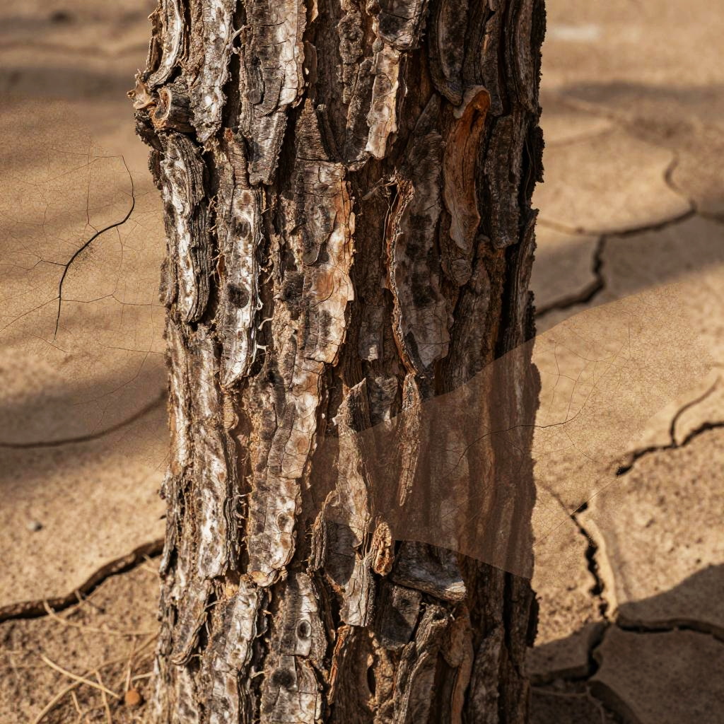 Photo blend combining close-up textures of tree bark and cracked desert earth, earth tones with intricate patterns layering together, abstract composition with organic shapes and high contrast lighting, artistic and visually striking.