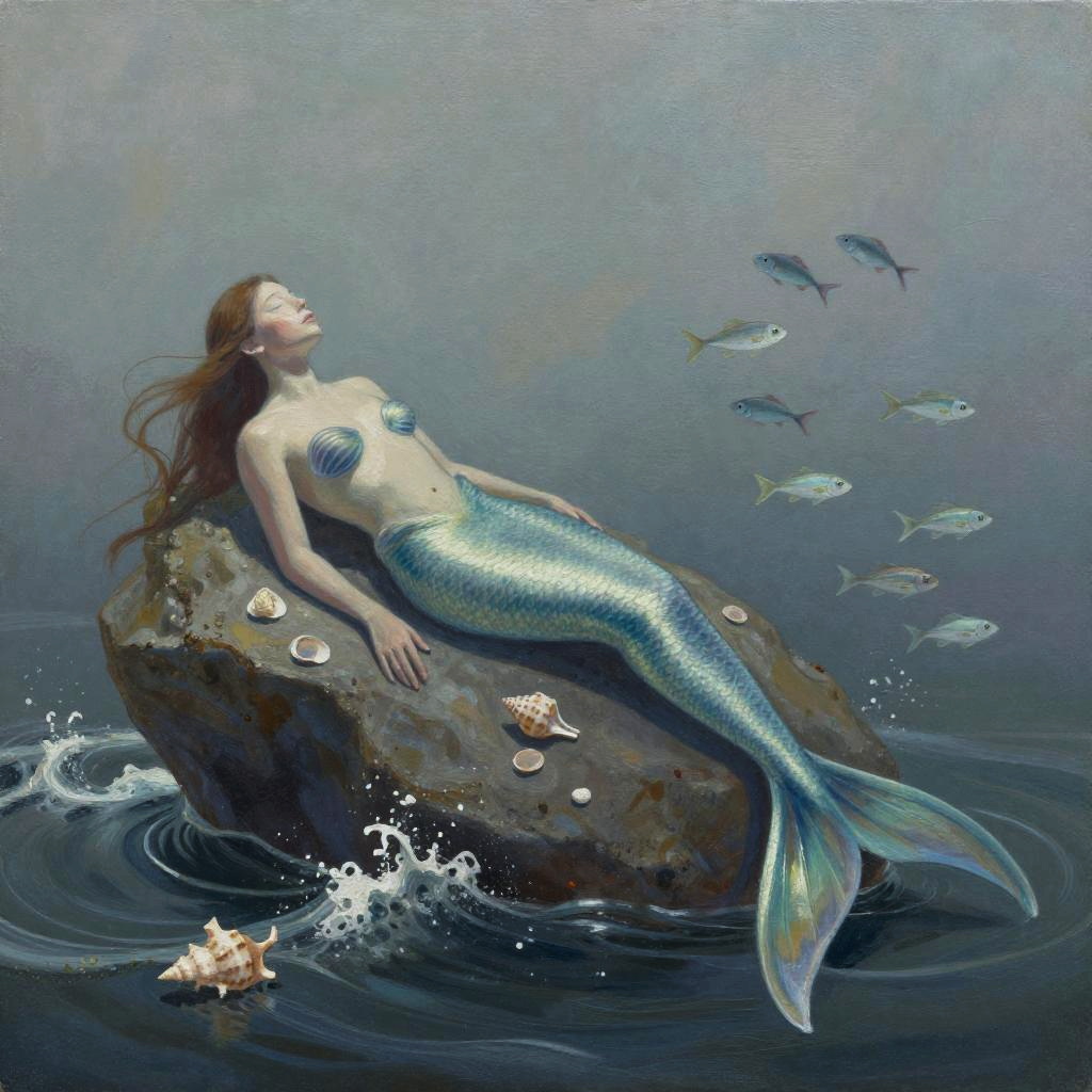 Realistic photo.A surreal depiction of a mermaid lounging on a rock, surrounded by waves, seashells, and schools of fish, styled in ethereal acrylic painting, with a tranquil mood, hyper-detailed, shadowed hues, minimalist textures, highly textured analog aesthetic realistic photo