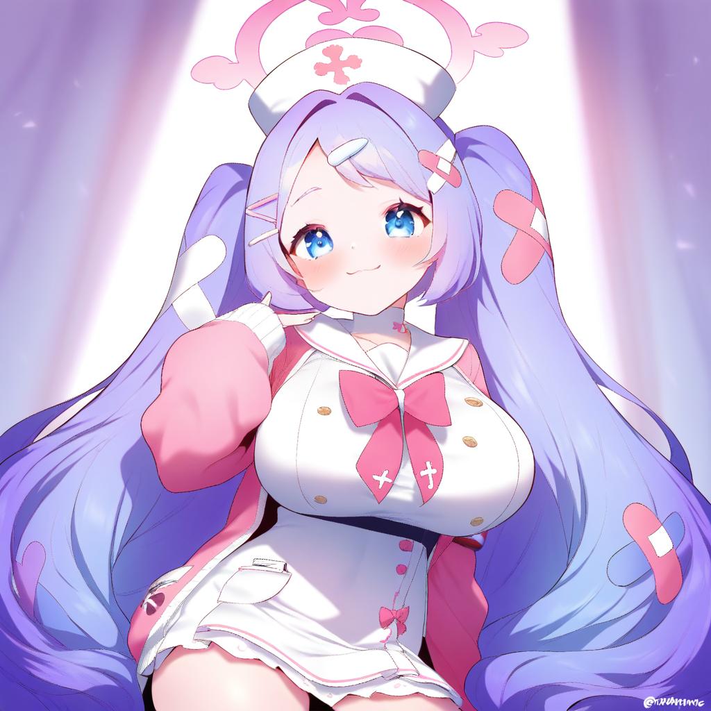 Hanae (blue archive), blue archive, 1girl, skin fang, blue eyes, purple hair, very long hair, long hair, bandaid hair ornament, twintails, hairclip, large breasts, nurse cap, halo, pink halo, long sleeves, by artist born-to-die, animagine