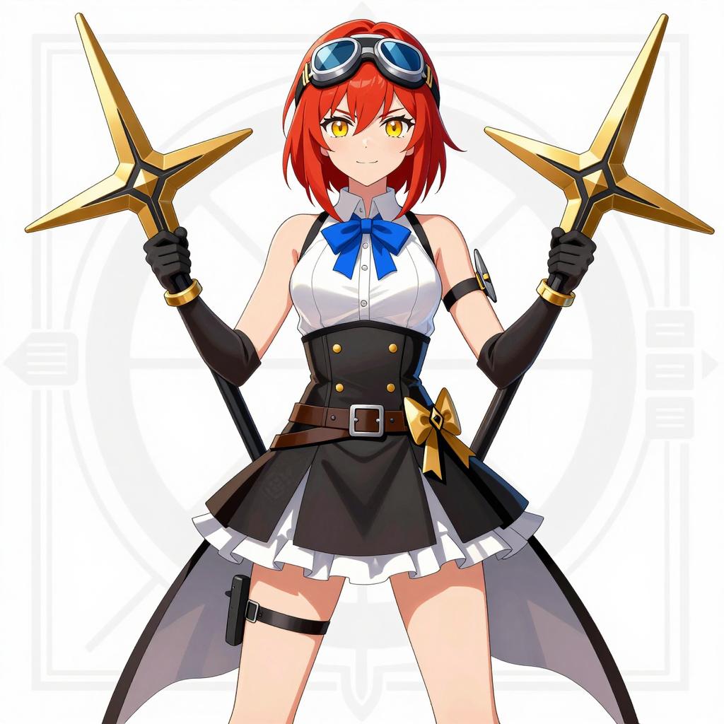 Digital illustration of a red-haired woman with horns, green eyes, and pink lips. She wears a blue jacket with pink swirls, white crop top, black shorts, pink thigh-high socks, and black shoes. She holds a white katana with pink patterns over her right shoulder. Her short hair is tousled. She stands with arms slightly apart, legs apart, and a confident stance. The background is a blue circle with white paint splatters. Her expression is confident. Artist's "YAJUU" is on the right.