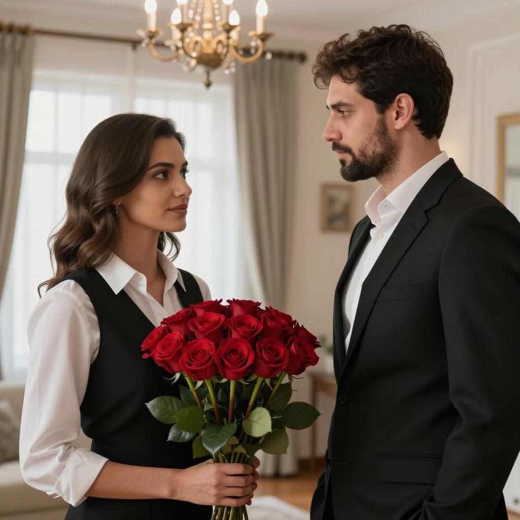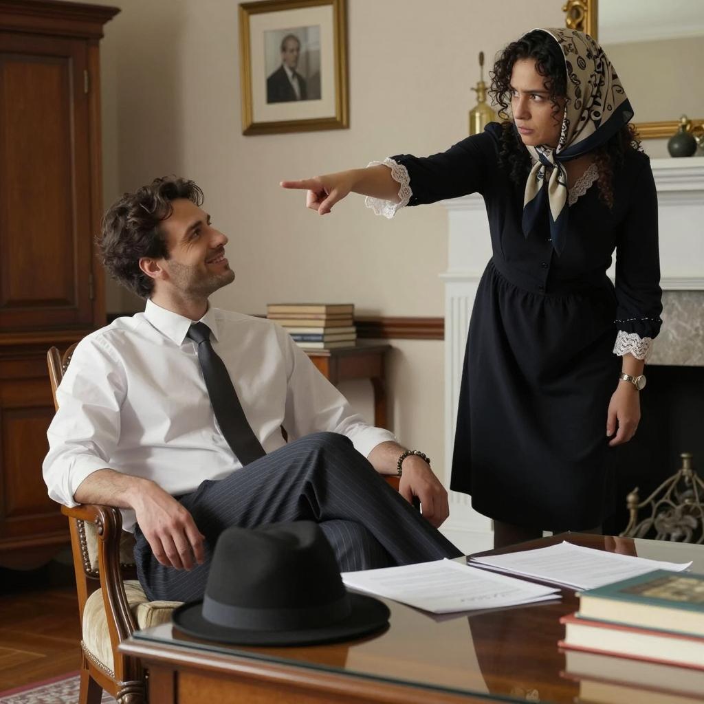 Two people in a room. Woman with curly black hair in a blue velvet dress points a stick at a man with black hair in a black suit with a polka dot shirt. Man covers his head with his hands. Background includes a beige couch, a wooden cabinet, and a mannequin. Red carpet on the floor. Woman leans forward, stick extends towards man's chest. Man's face shows intense expression.