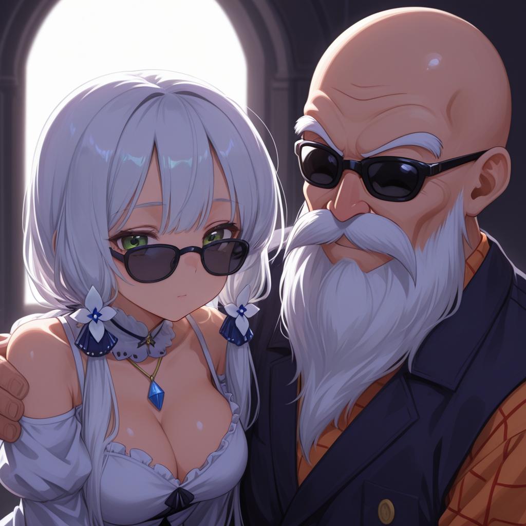 Muten roushi, dragon ball, 1boy, beard, mustache, white hair, sunglasses, bald, old man, by artist klaius, dark_illustrious
