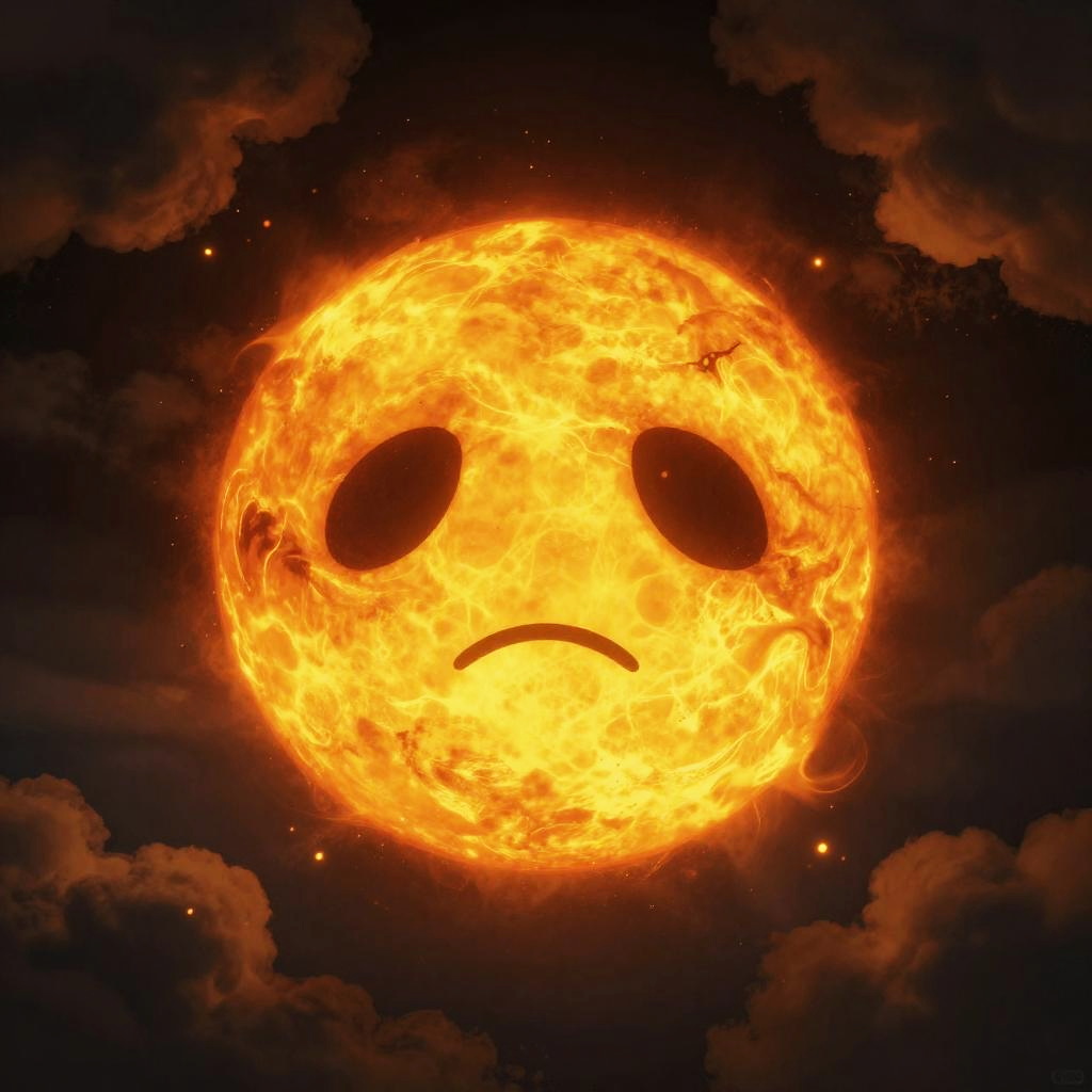 This is a digital artwork of a glowing, orange-yellow sun-like sphere with two black, oval-shaped eyes and a sad, curved line for a mouth. The sphere is surrounded by dark, fluffy clouds with small, glowing embers scattered throughout. The bright light from the sphere creates a dramatic, fiery effect, making the clouds appear almost translucent. The overall vibe is eerie and somewhat melancholic.
