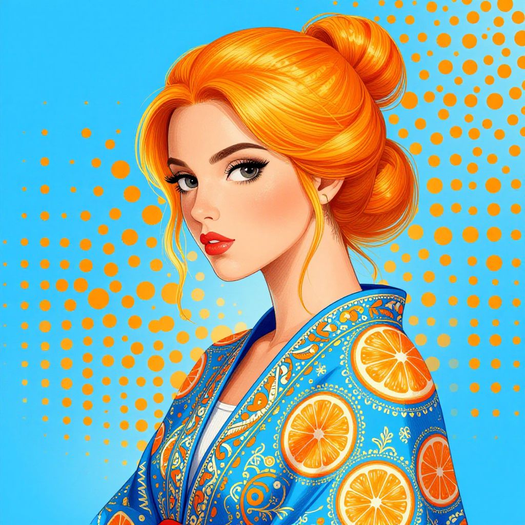 A vibrant digital illustration features a woman with golden-orange hair styled in an elegant updo, wearing a detailed blue garment adorned with orange slices and intricate patterns. The artwork combines bold outlines with smooth shading, set against a bright blue background with large orange dots, creating a modern pop-art aesthetic.