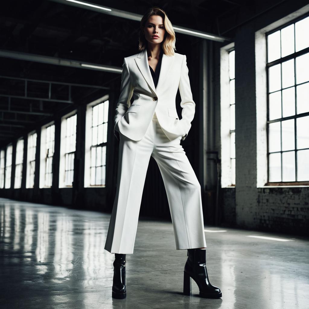 Blonde woman dressed in a beige bohemian maxi dress with fringe details and a wide leather belt, paired with black high-heeled ankle boots. She poses confidently in a gritty industrial foundry with worn brick walls and metal pipes. The photo features cinematic lighting with sharp focus and rich textures, showcasing an elegant high-fashion editorial style.