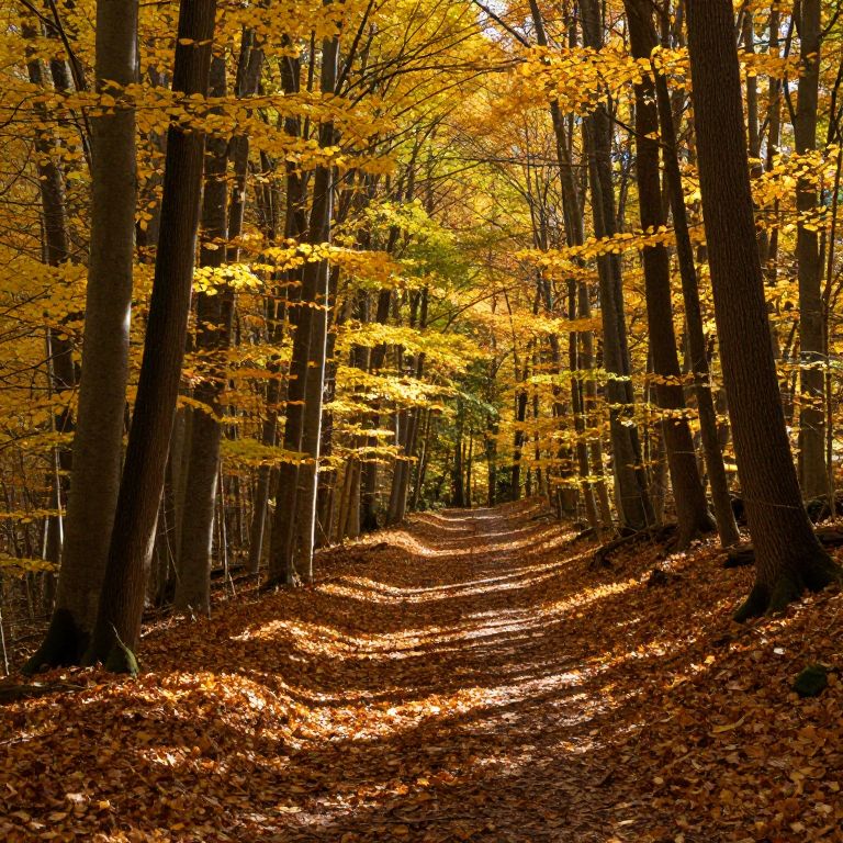 Arnolds dense forest trail in autumn, golden leaves covering the ground, sunlight filtering through tall trees creating dramatic shadows, a winding path inviting exploration, vivid and serene natural landscape, highly detailed nature scene