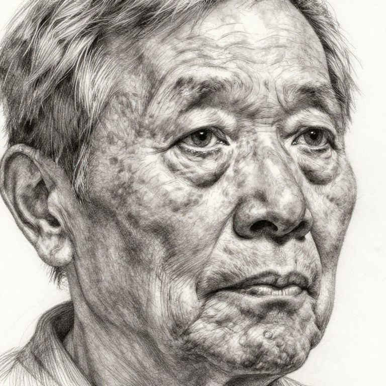 Drawing photo reference featuring a close-up portrait of an elderly person, focusing on wrinkles, expressive eyes, and textured skin, captured with careful cross-hatching and blending to evoke emotion and realism