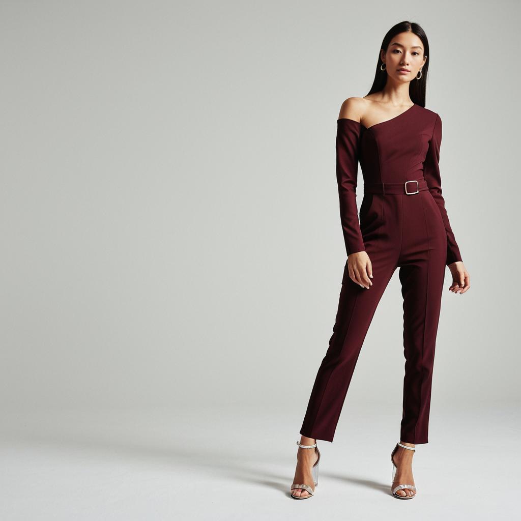 Woman, contemporary sleek, form-fitting jumpsuit in solid burgundy, one-shoulder design with long sleeve, straight-leg cut, subtle seam detailing, clear strap heeled sandals, studio background with light shadowing.
