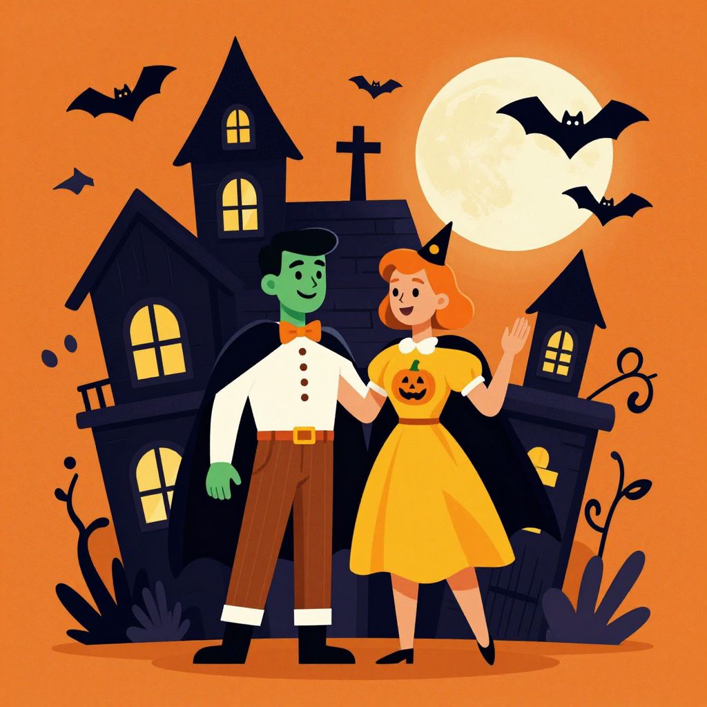 The image is a vibrant, mid-century retro Halloween illustration featuring two characters in a whimsical, cartoonish style. The background is a warm orange, with a full moon and bats flying in the sky, creating a festive and eerie atmosphere. The characters, a man and a woman, are dressed in traditional Halloween attire; the man wears a green face with a bow tie and a black cape, while the woman is in a yellow dress with a pumpkin design. They stand in front of a tall, dark house with a lit window, adding to the Halloween theme. The scene is adorned with various Halloween elements, such as a tree with leaves and a vine, and a cross on the house, all rendered in a flat, vector style with bold lines and bright colors. The overall composition is balanced, with the characters centrally positioned and the elements of the background arranged to create a cohesive and engaging visual narrative.