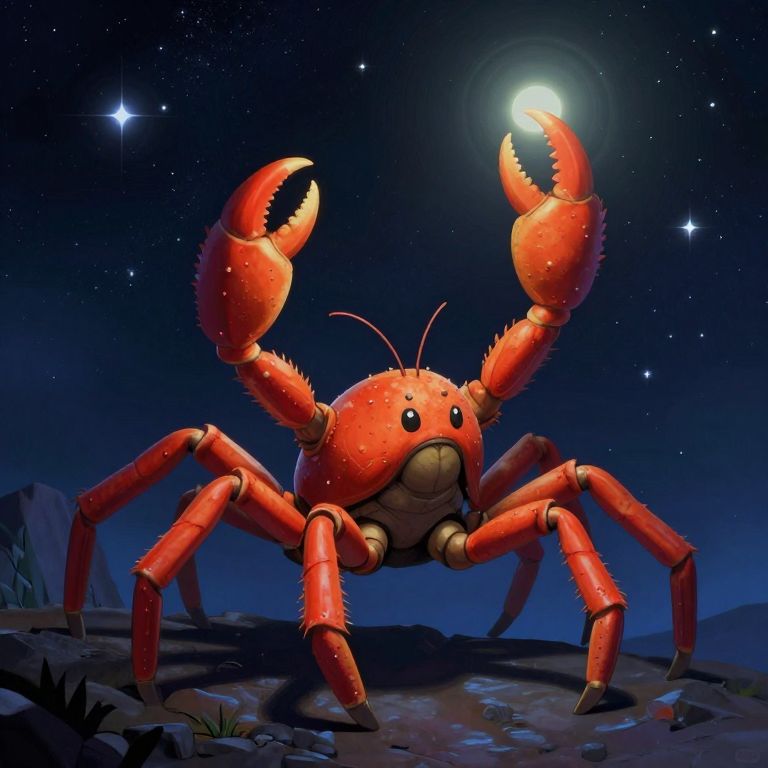 Under the celestial canopy of stars, the vibrant form of Cancer emerges as a guardian of introspection, its claws reaching toward the luminous heavens, embodying the duality of protection and vulnerability amidst the infinite expanse.