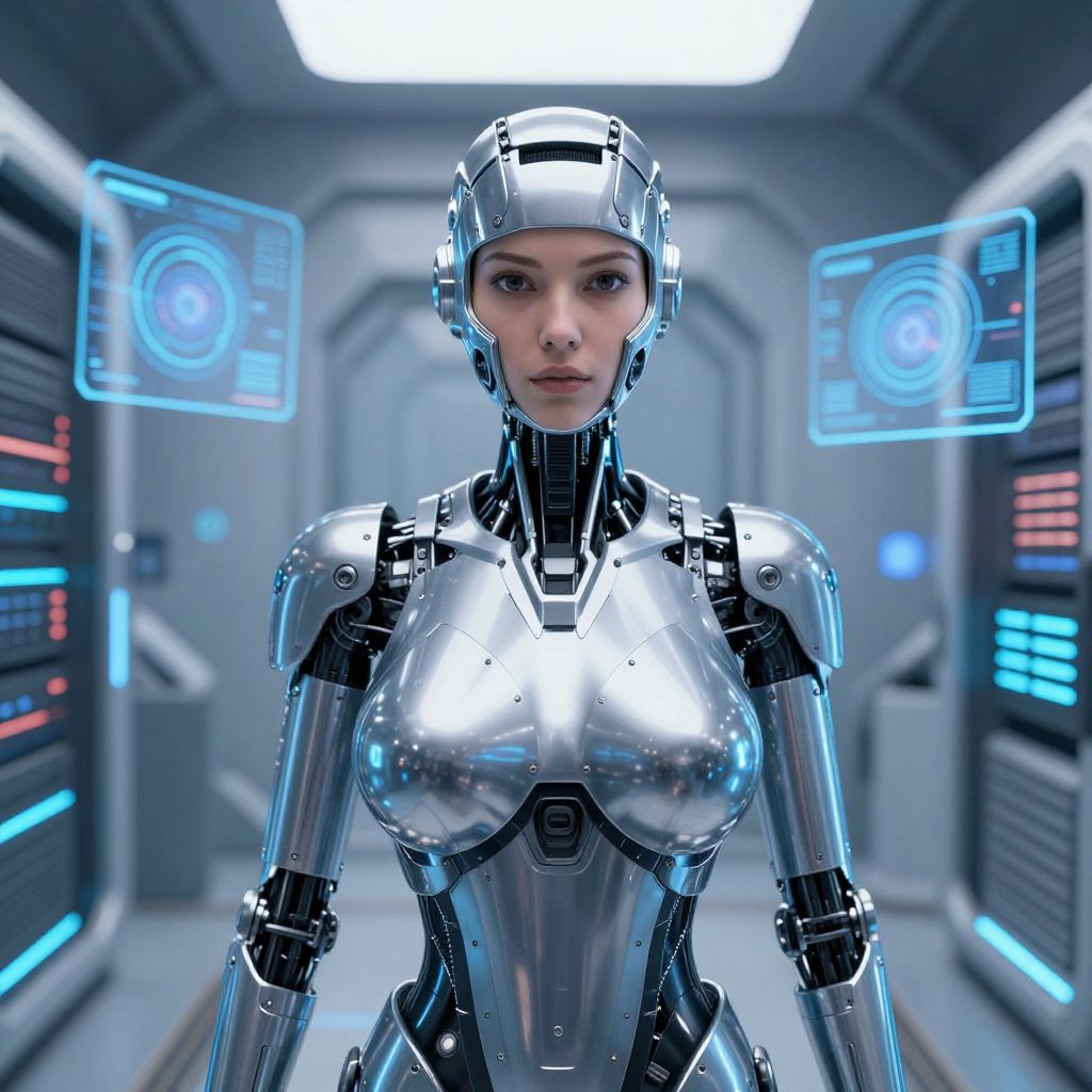 A sci-fi android woman with a calm, composed expression and sharp, featureless facial structure made of interlocking chrome panels stands inside a high-tech underground data center, her silver armor reflecting cold blue LED lights, surrounded by floating servers and rotating holograms, the setting full of cold, minimalist technology and futuristic machinery.. The woman has big tits and cute face