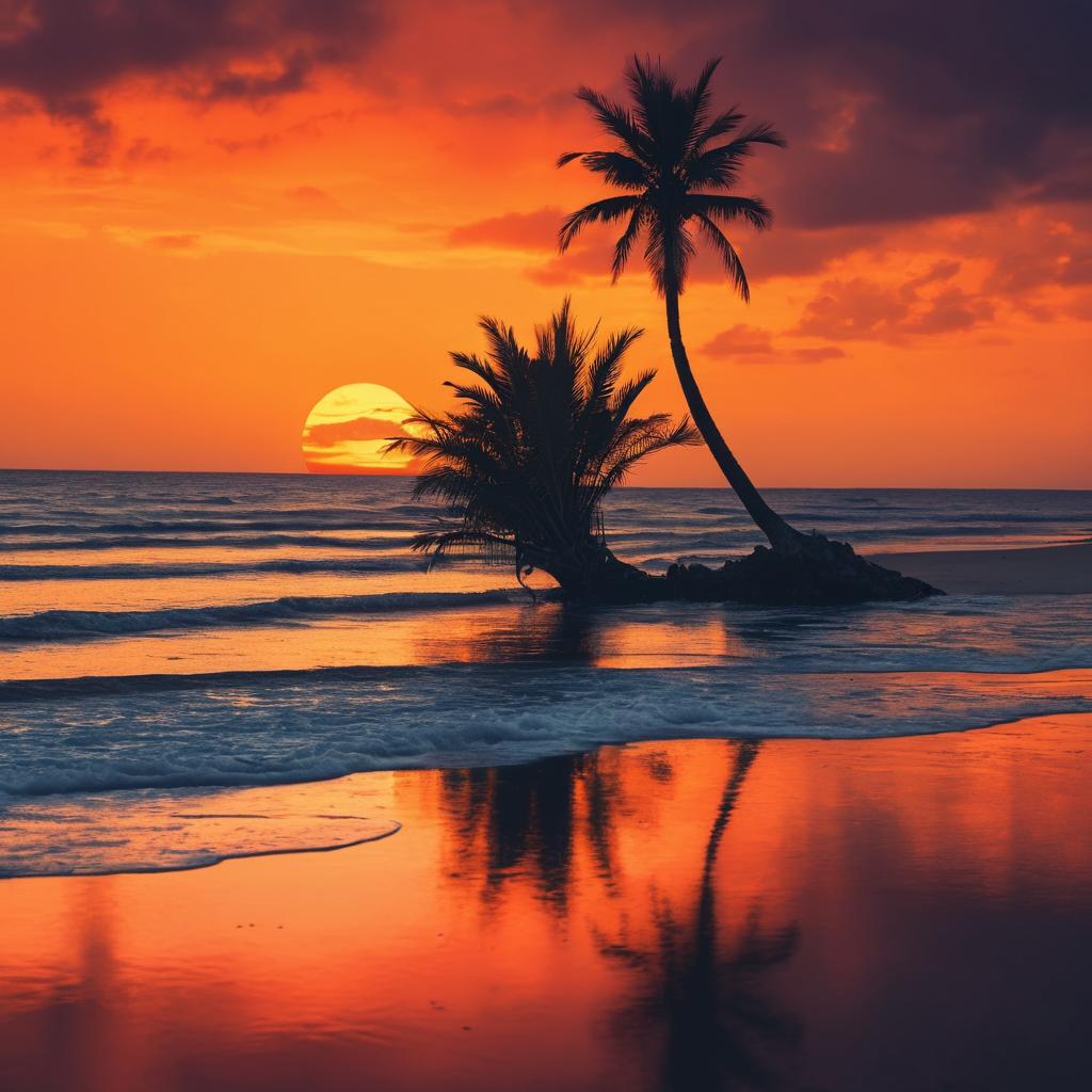 Tree, no humans, outdoors, palm tree, sunset, sky, scenery, cloud, water, ocean, orange sky, evening, beach, horizon, reflection, shore, cloudy sky, gradient sky, twilight
