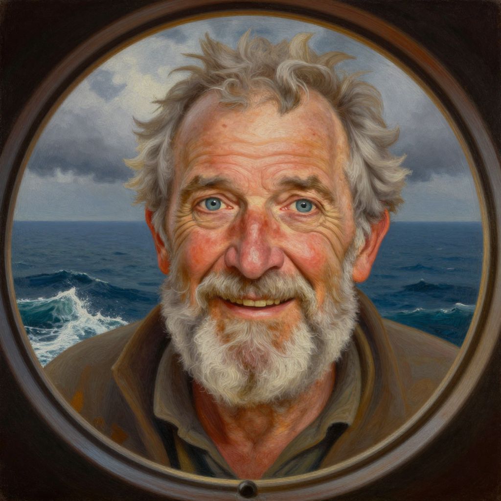Craft a hyperrealistic oil painting portrait of an elderly man exuding cheerfulness and compassion, featuring intense blue eyes and a rugged salt-and-pepper beard. Capture him from an unusual high angle, as if viewed through a porthole at sea, emphasizing his gaze and weathered features. In the background, showcase a vast ocean horizon merging with a stormy sky, distant waves crashing against the ship's hull. Employ warm colors and subtle lighting to evoke a sense of resilience and inner strength, inspiring admiration for his time-tested experience and melancholic longing for untamed waters.