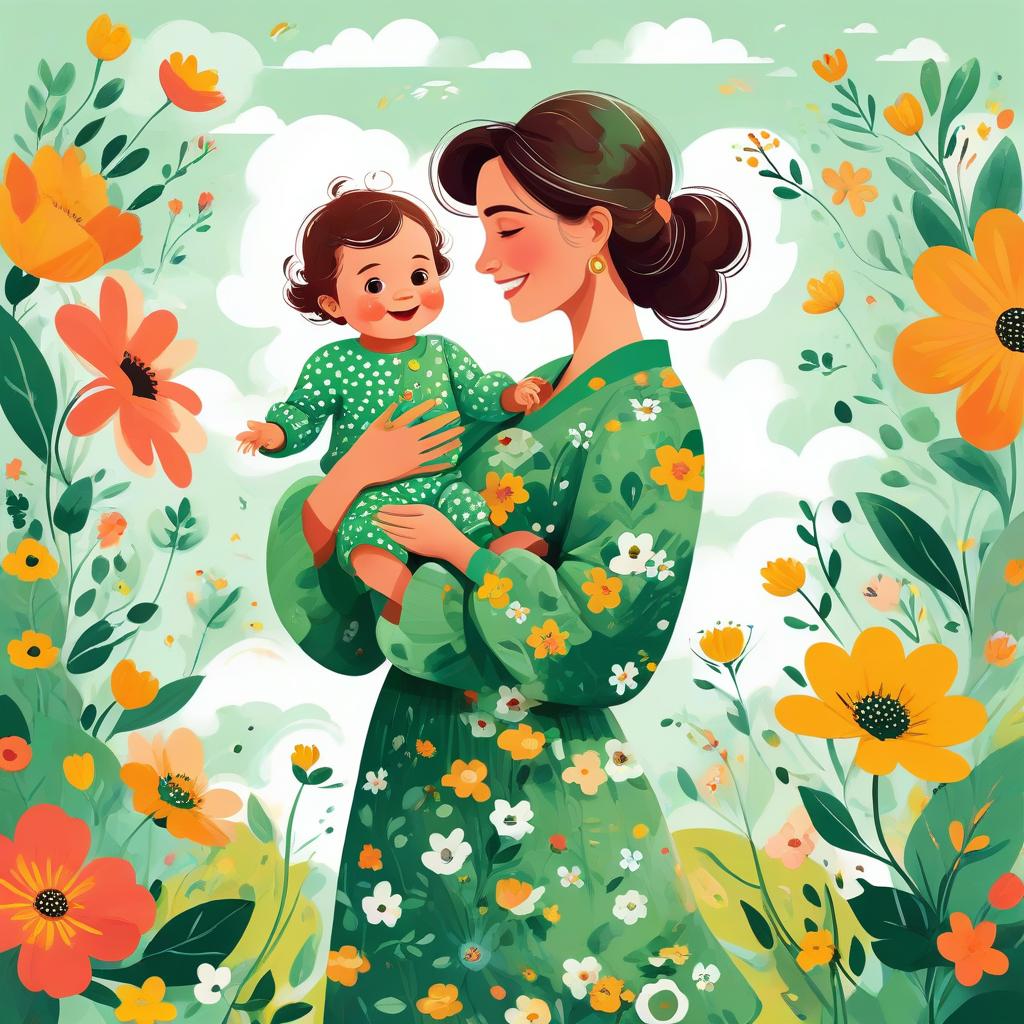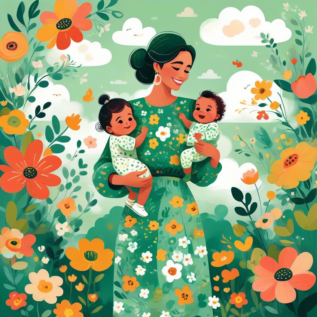 2D flat vector art of a smiling mother wearing a green floral dress holding a baby and a toddler. Both children are dressed in green polka dot outfits. The scene is set amid a lush garden with large, colorful flowers and leaves, under a cloudy sky. The artwork features bright colors and evokes a playful and happy mood.