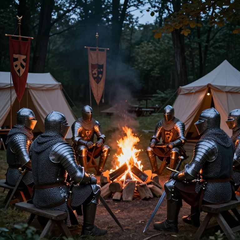 Medieval knights gathered around a campfire at twilight, wearing detailed chainmail and plate armor, polished swords and banners with heraldic symbols, cozy forest clearing with tents, warm glowing light contrasted with cool evening shades, storybook fantasy style.