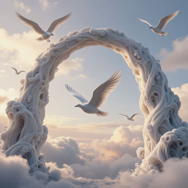 Digital artwork depicting a surreal, white, cloud-like arch with intricate, swirling patterns, set against a bright, partly cloudy sky. Five white birds with outstretched wings are in mid-flight around and through the arch. The arch's texture is smooth and flowing, resembling both clouds and waves. The sunlight filters through the clouds, casting a soft glow on the scene. The overall aesthetic is ethereal and dreamlike, blending elements of fantasy and nature.