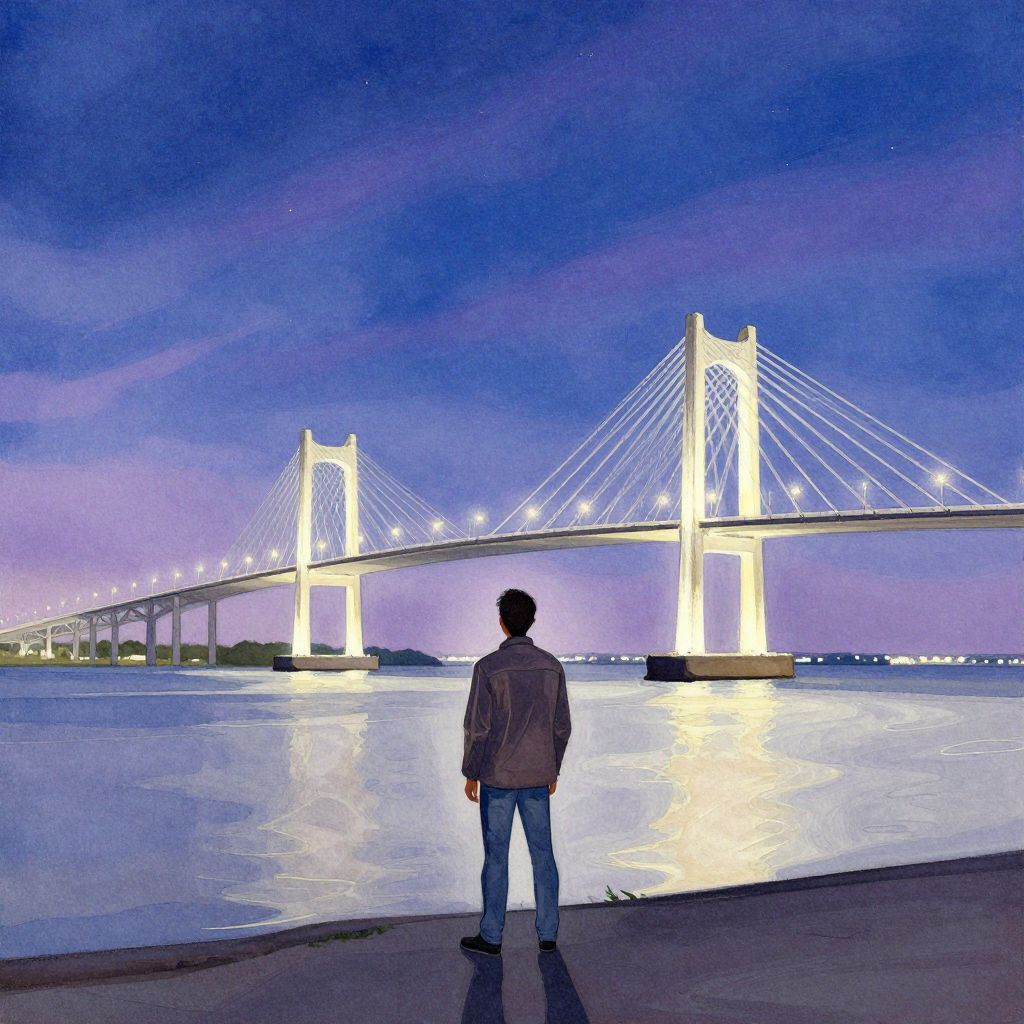 Photograph-like digital art depicts a man standing on a dark, reflective shore at night, facing a brightly illuminated cable-stayed bridge spanning a calm body of water. The man, wearing a brown jacket and blue jeans, is centered in the foreground, silhouetted against the bridge's glowing white lights and cables. The sky is a gradient of deep blue to purple, with subtle cloud textures. The bridge's reflection shimmers on the water's surface. The overall color palette includes dark blues, whites, and browns, creating a serene, contemplative atmosphere.