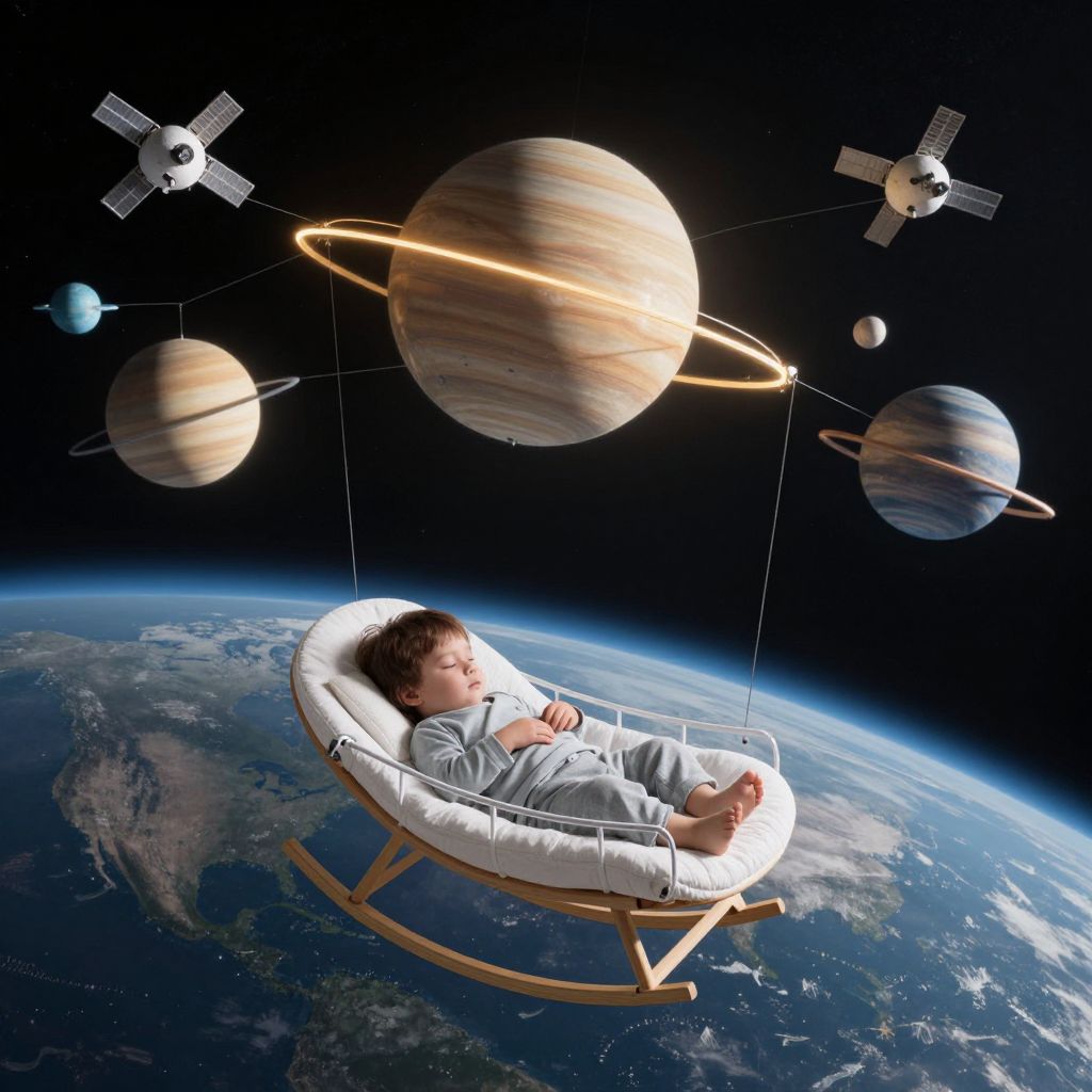 Photorealistic CGI image of four children, two boys and two girls, riding plush, pig-shaped vehicles in space. Each pig has a glowing light on top and is connected by a curved, invisible line. The children wear casual clothes; one boy in a blue shirt and brown shorts, others in pink and white outfits. Earth with visible continents and white clouds is in the background, with deep blue space occupying the rest of the frame. The image conveys a whimsical, dreamlike quality.